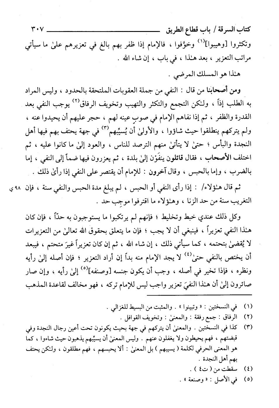 ومن أصحابنا من قال: النفي من جملة العقوبات الملتحقة بالحدود، وليس المراد به الطلب إذاً، ولكن التجمع والتكثر والتهيب وتخويف الرفاق (2) يوجب النفي بعد القدرة والظفر، ثم إذا نفاهم الإمام في صوبٍ عينه لهم، حجر عليهم أن يحيدوا عنه، ولم يتركهم ينطلقوا حيث شاؤوا، والأولى أن يُسيِّبهم (3) في جهة يحتف بهم فيها أهل النجدة والبأس؛ حتى لا يتأتى منهم الترصد للناس، والعود إلى ما كانوا عليه، ثم اختلف الأصحاب، فقال قائلون ينفَوْن إلى بلدة، ثم يعزرون فيها ضماً إلى النفي، إما بالضرب، وإما بالحبس، وقال آخرون: للإمام أن يقتصر على النفي إذا رأى ذلك.