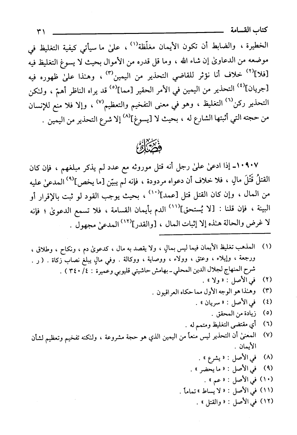 (1) المذهب تغليظ الأيمان فيما ليس بمالٍ، ولا يقصد به مال، كدعوى دم، ونكاح، وطلاق، ورجعة، وإيلاء، وعتق، وولاء، ووصاية، ووكالة. وفي مالٍ يبلغ نصاب زكاة. (ر. شرح المنهاج لجلال الدين المحلي - بهامش حاشيتي قليوبي وعميرة: 4/ 340).