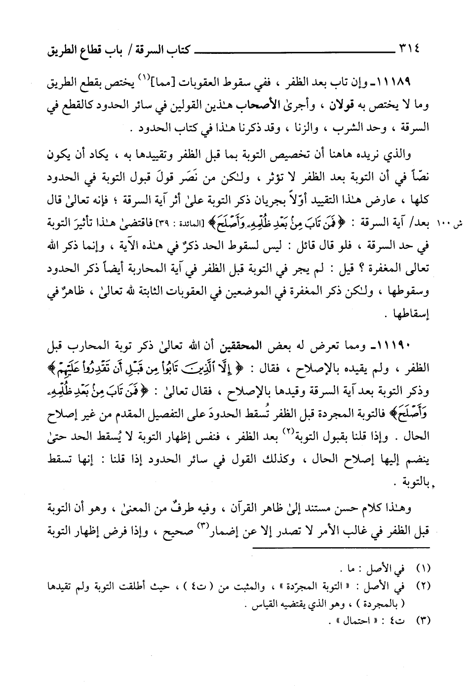 والذي نريده هاهنا أن تخصيص التوبة بما قبل الظفر وتقييدها به، يكاد أن يكون نصّاً في أن التوبة بعد الظفر لا تؤثر، ولكن من نَصَر قولَ قبول التوبة في الحدود كلها، عارض هذا التقييد أوّلاً بجريان ذكر التوبة على أثر آية السرقة؛ فإنه تعالى قال بعد آية السرقة: {فَمَنْ تَابَ مِنْ بَعْدِ ظُلْمِهِ وَأَصْلَحَ} [المائدة: 39] فاقتضى هذا تأثيرَ التوبة في حد السرقة، فلو قال قائل: ليس لسقوط الحد ذكرٌ في هذه الآية، وإنما ذكر الله تعالى المغفرة؟ قيل: لم يجر في التوبة قبل الظفر في آية المحاربة أيضاً ذكر الحدود وسقوطها، ولكن ذكر المغفرة في الموضعين في العقوبات الثابتة لله تعالى، ظاهرٌ في