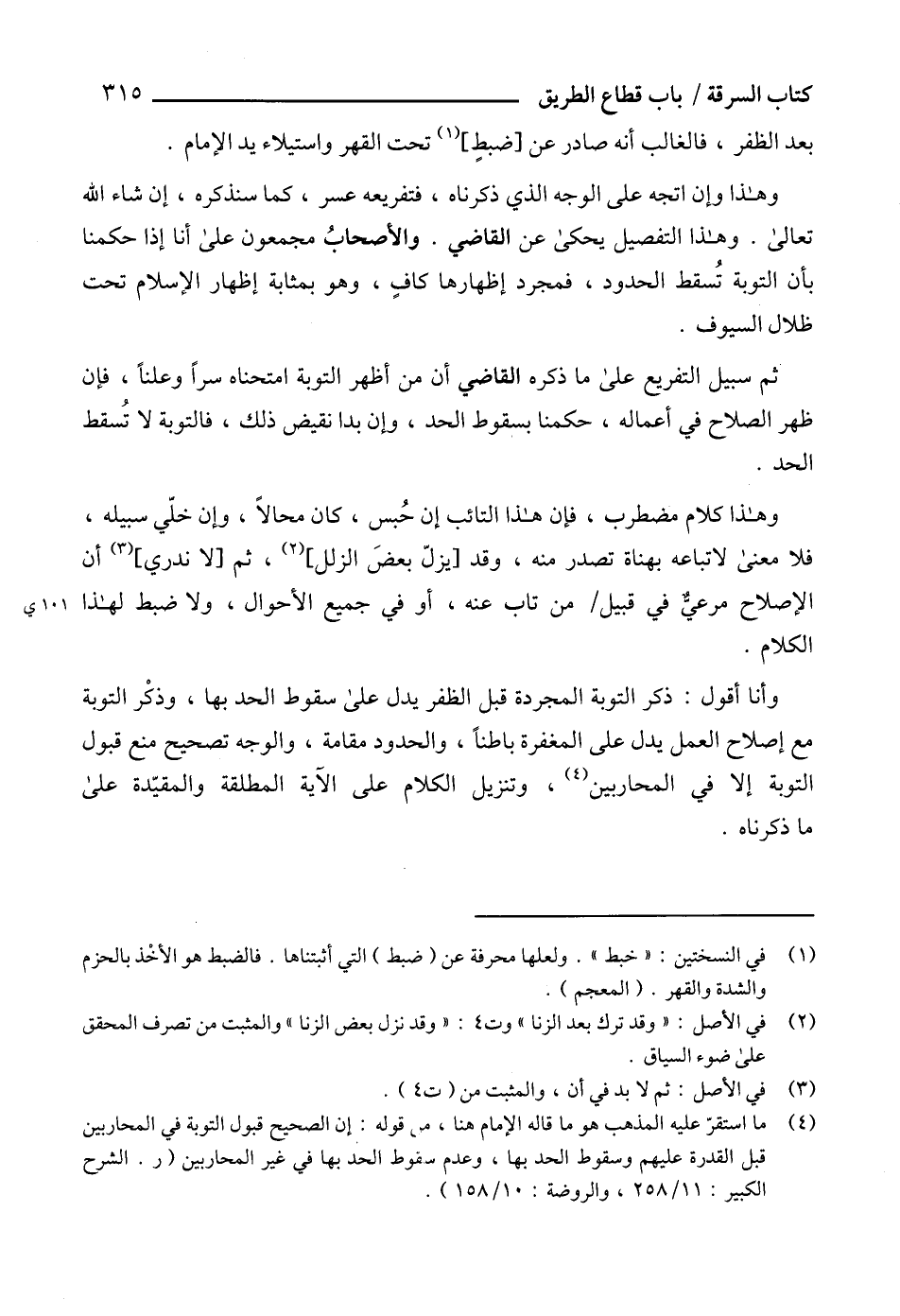 (4) ما استقرّ عليه المذهب هو ما قاله الإمام هنا،، قوله: إن الصحيح قبول التوبة في المحاربين قبل القدرة عليهم وسقوط الحد بها، وعدم سقوط الحد بها في غير المحاربين (ر. الشرح الكبير: 11/ 258، والروضة: 10/ 158).