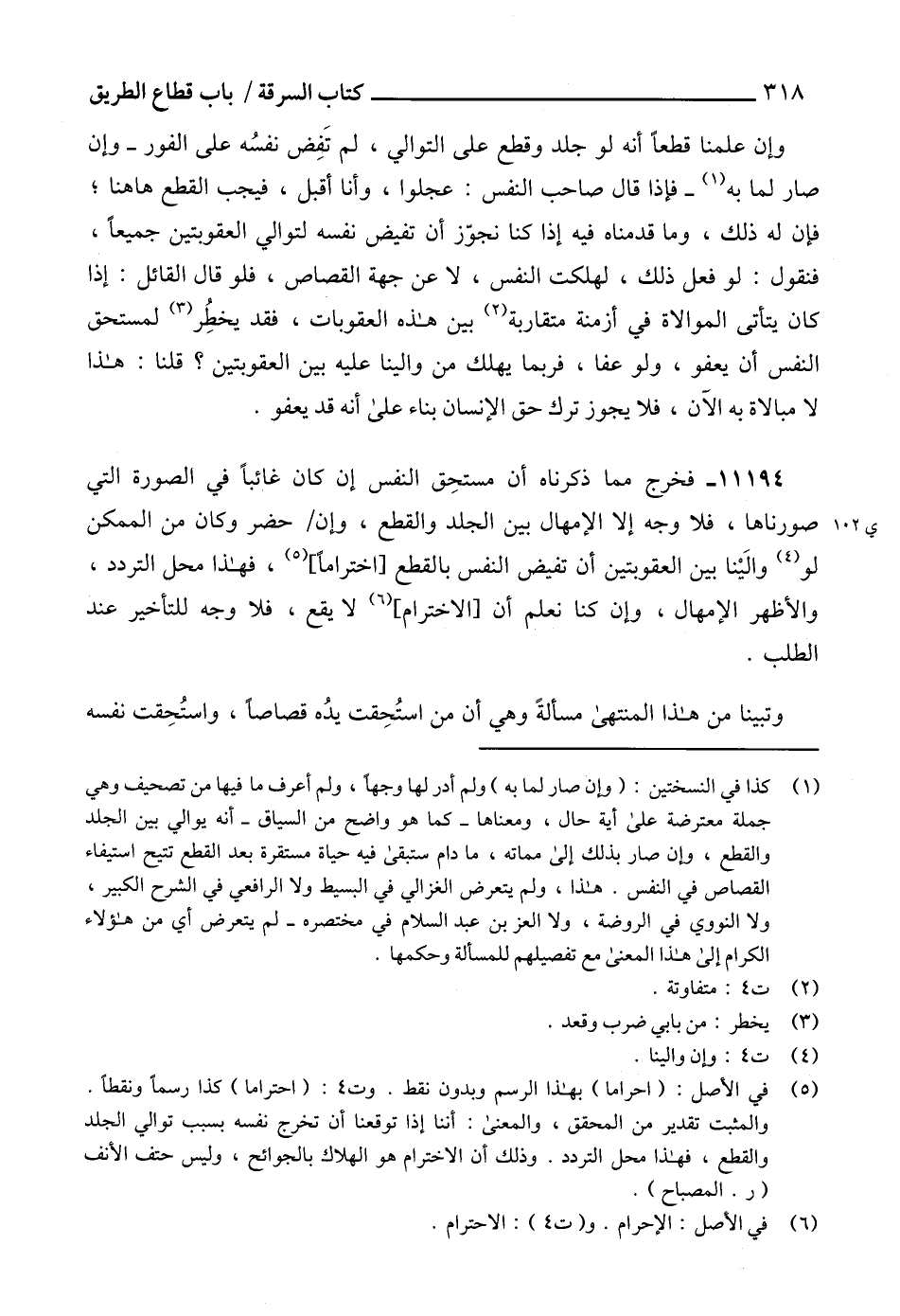 (1) كذا في النسختين: (وإن صار لما به) ولم أدر لها وجهاً، ولم أعرف ما فيها من تصحيف وهي جملة معترضة على أية حال، ومعناها -كما هو واضح من السياق- أنه يوالي بين الجلد والقطع، وإن صار بذلك إلى مماته، ما دام ستبقى فيه حياة مستقرة بعد القطع تتيح استيفاء القصاص في النفس. هذا، ولم يتعرض الغزالي في البسيط ولا الرافعي في الشرح الكبير، ولا النووي في الروضة، ولا العز بن عبد السلام في مختصره- لم يتعرض أي من هؤلاء الكرام إلى هذا المعنى مع تفصيلهم للمسألة وحكمها.