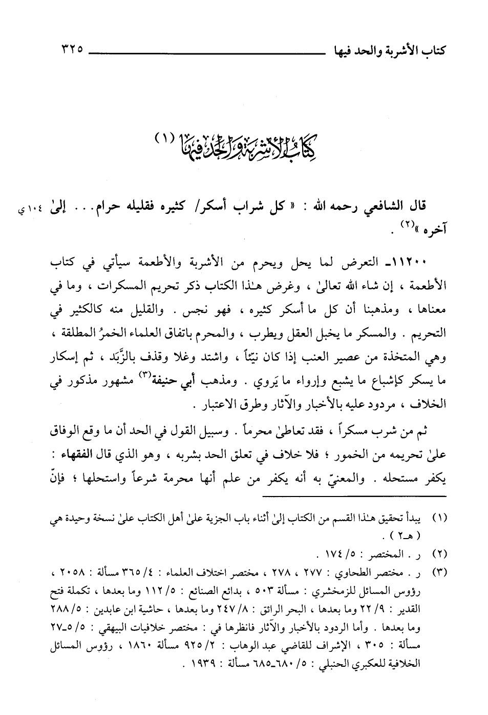 11200 - التعرض لما يحل ويحرم من الأشربة والأطعمة سيأتي في كتاب الأطعمة، إن شاء الله تعالى، وغرض هذا الكتاب ذكر تحريم المسكرات، وما في معناها، ومذهبنا أن كل ما أسكر كثيره، فهو نجس. والقليل منه كالكثير في التحريم. والمسكر ما يخبل العقل ويطرب، والمحرم باتفاق العلماء الخمرُ المطلقة، وهي المتخذة من عصير العنب إذا كان نيّئاً، واشتد وغلا وقذف بالزَّبَد، ثم إسكار ما يسكر كإشباع ما يشبع وإرواء ما يَروي. ومذهب أبي حنيفة (3) مشهور مذكور في الخلاف، مردود عليه بالأخبار والآثار وطرق الاعتبار.
