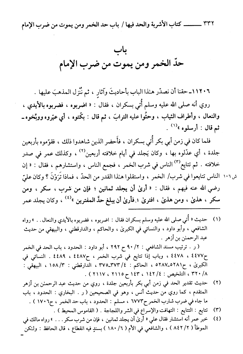 (ر. ترتيب مسند الشافعي: 2/ 90 ح 292، أبو داود: الحدود، باب الحد في الخمر ح 4477، 4478، وباب إذا تتايع في شرب الخمر، ح 4487، 4489. النسائي في الكبرى، ح 5281 - 5287، الحاكم: 4/ 373 - 375، الدارقطني: 3/ 158، البيهقي: 8/ 320، التلخيص: 42/ 14، 143 ح 2115، 2117).