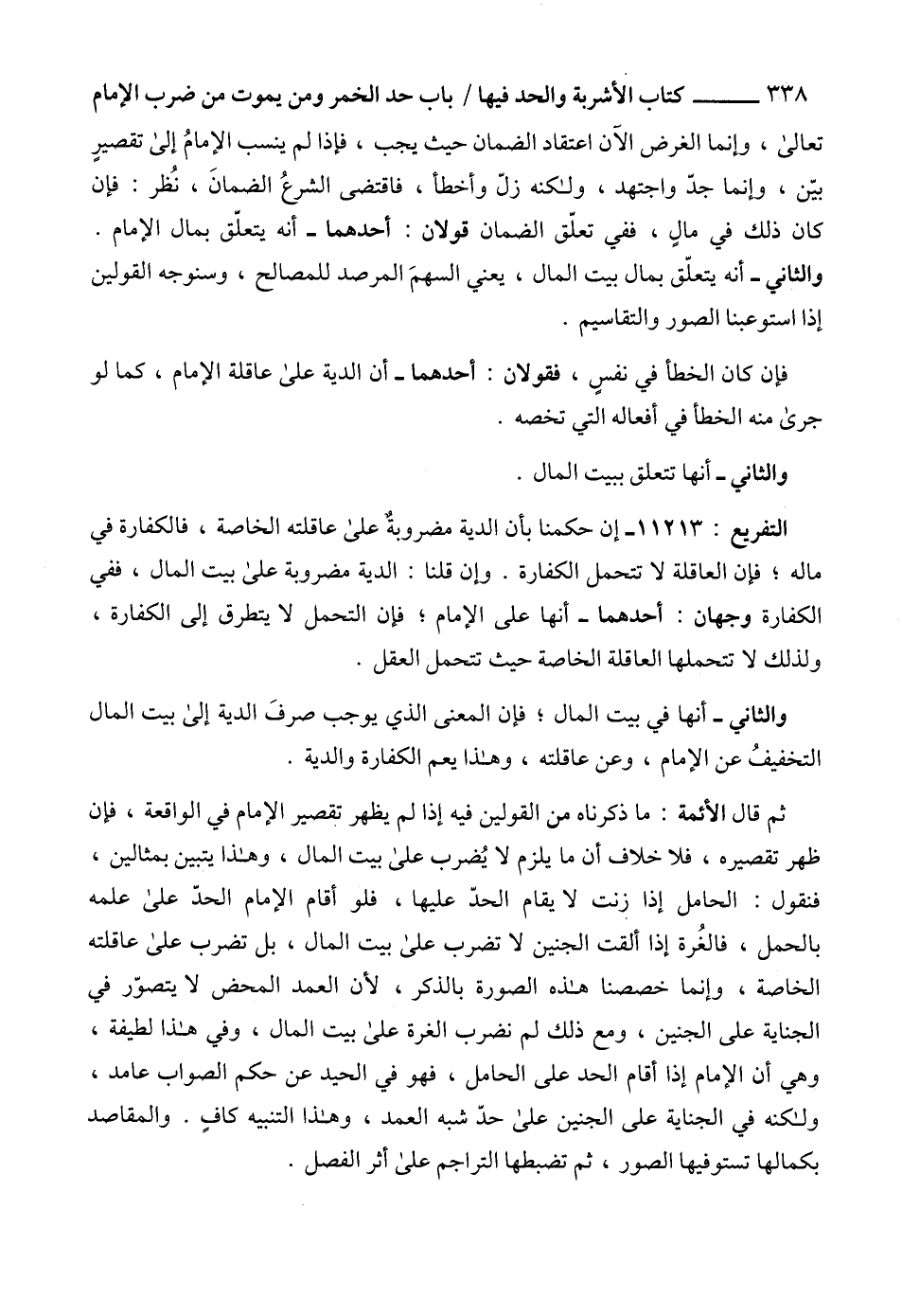 ثم قال الأئمة: ما ذكرناه من القولين فيه إذا لم يظهر تقصير الإمام في الواقعة، فإن ظهر تقصيره، فلا خلاف أن ما يلزم لا يُضرب على بيت المال، وهذا يتبين بمثالين، فنقول: الحامل إذا زنت لا يقام الحدّ عليها، فلو أقام الإمام الحدّ على علمه بالحمل، فالغُرة إذا ألقت الجنين لا تضرب على بيت المال، بل تضرب على عاقلته الخاصة، وإنما خصصنا هذه الصورة بالذكر، لأن العمد المحض لا يتصوّر في الجناية على الجنين، ومع ذلك لم نضرب الغرة على بيت المال، وفي هذا لطيفة، وهي أن الإمام إذا أقام الحد على الحامل، فهو في الحيد عن حكم الصواب عامد، ولكنه في الجناية على الجنين على حدّ شبه العمد، وهذا التنبيه كافٍ. والمقاصد بكمالها تستوفيها الصور، ثم تضبطها التراجم على أثر الفصل.