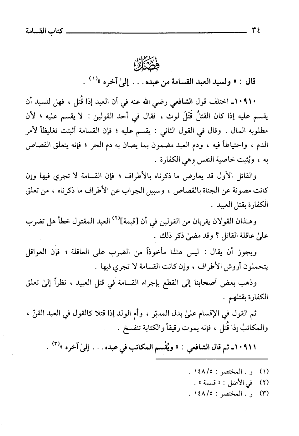 10910 - اختلف قول الشافعي رضي الله عنه في أن العبد إذا قُتل، فهل للسيد أن يقسم عليه إذا كان القتلُ قَتْلَ لوث، فقال في أحد القولين: لا يقسم عليه؛ لأن مطلوبه المال. وقال في القول الثاني: يقسم عليه؛ فإن القسامة أثبتت تغليظاً لأمر الدم، واحتياطاً فيه، ودم العبد مضمون بما يصان به دم الحر؛ فإنه يتعلق القصاص به، ويُثبت خاصية النفس وهي الكفارة.