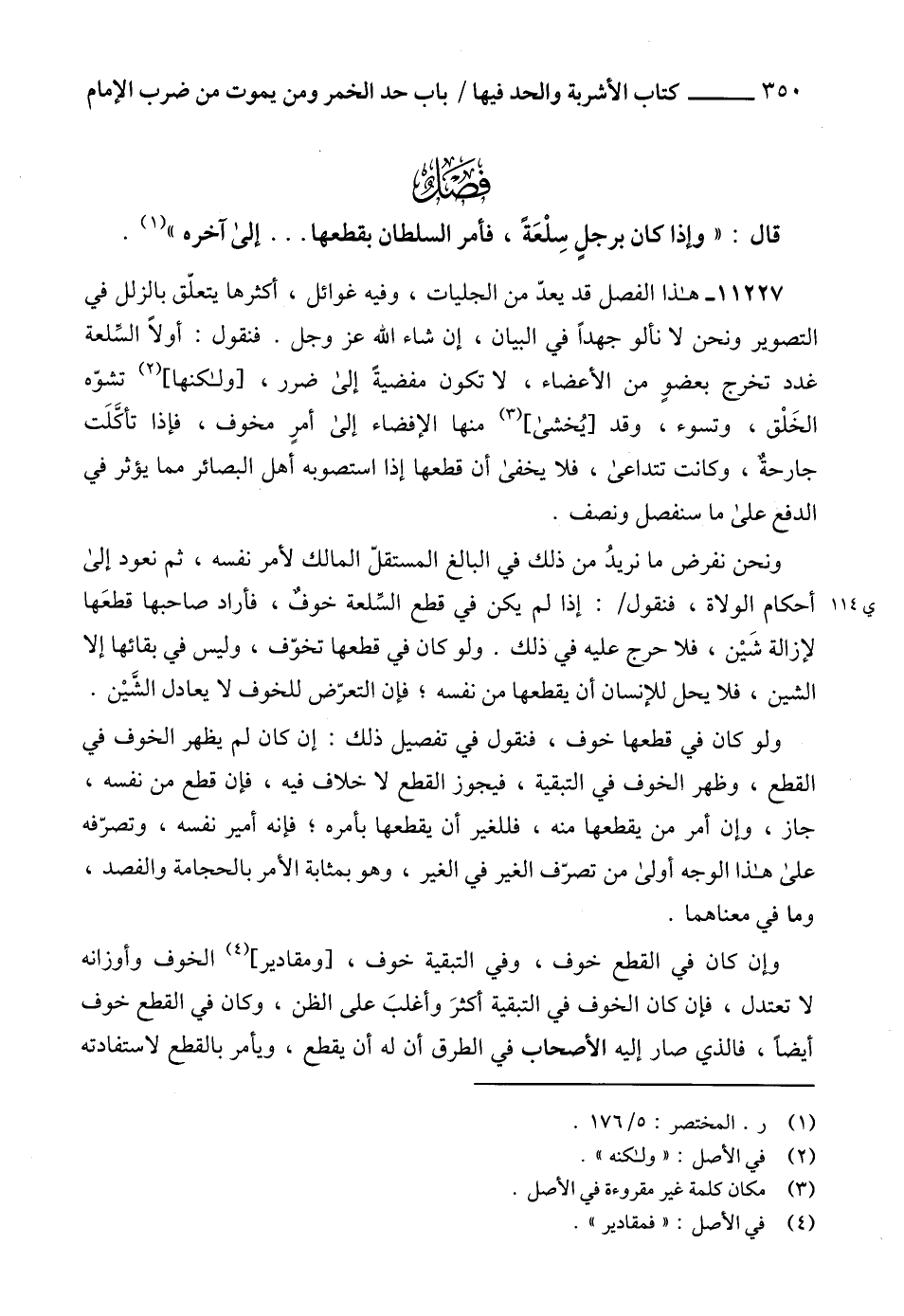 11227 - هذا الفصل قد يعدّ من الجليات، وفيه غوائل، أكثرها يتعلّق بالزلل في التصوير ونحن لا نألو جهداً في البيان، إن شاء الله عز وجل. فنقول: أولاً السِّلعة غدد تخرج بعضوٍ من الأعضاء، لا تكون مفضيةً إلى ضرر، [ولكنها] (2) تشوّه الخَلْق، وتسوء، وقد [يُخشى] (3) منها الإفضاء إلى أمرٍ مخوف، فإذا تأكَّلَت جارحةٌ، وكانت تتداعى، فلا يخفى أن قطعها إذا استصوبه أهل البصائر مما يؤثر في الدفع على ما سنفصل ونصف.