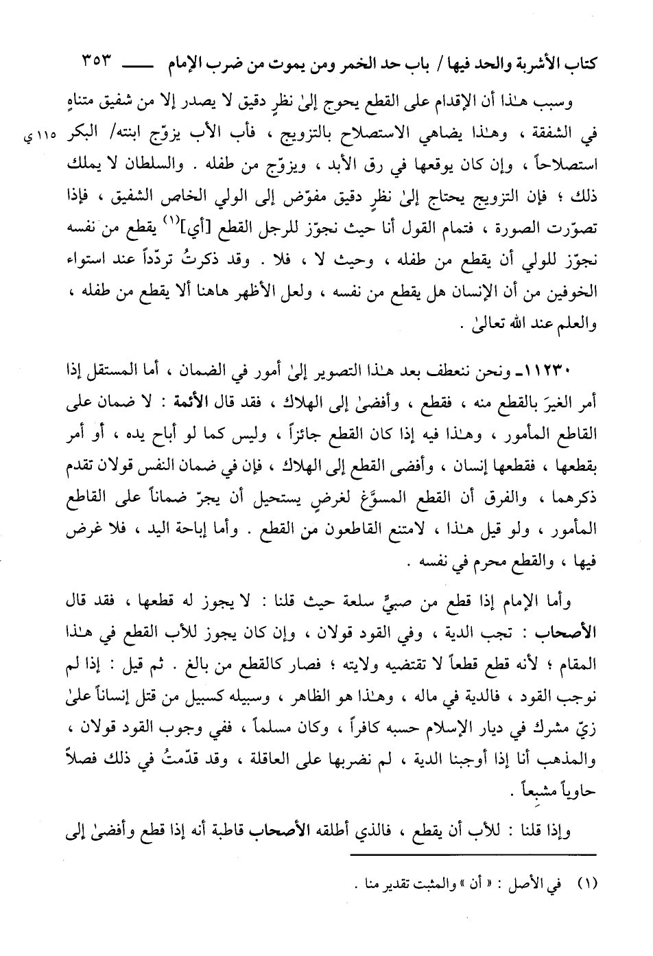 وسبب هذا أن الإقدام على القطع يحوج إلى نظرٍ دقيق لا يصدر إلا من شفيق متناهٍ في الشفقة، وهذا يضاهي الاستصلاح بالتزويج، فأب الأب يزوّج ابنته البكر استصلاحاً، وإن كان يوقعها في رق الأبد، ويزوّج من طفله. والسلطان لا يملك ذلك؛ فإن التزويج يحتاج إلى نظرٍ دقيق مفوّض إلى الولي الخاص الشفيق، فإذا تصوّرت الصورة، فتمام القول أنا حيث نجوّز للرجل القطع [أي] (1) يقطع من نفسه نجوّز للولي أن يقطع من طفله، وحيث لا، فلا. وقد ذكرتُ تردّداً عند استواء الخوفين من أن الإنسان هل يقطع من نفسه، ولعل الأظهر هاهنا ألا يقطع من طفله، والعلم عند الله تعالى.