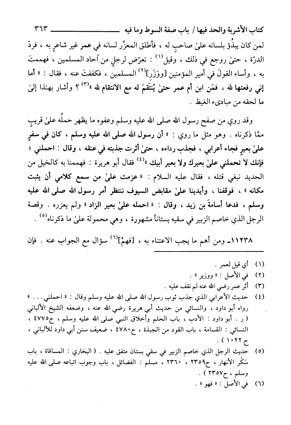 وقد روي من صفح رسول الله صلى الله عليه وسلم وعفوه ما يظهر حملُه على قريب ممَّا ذكرناه. وهو مثل ما روي: " أن رسول الله صلى الله عليه وسلم، كان في سفرٍ على بعيرٍ فجاء أعرابي، فجذب رداءه، حتى أثرت جذبته في عنقه، وقال: احملني؛ فإنك لا تحملني على بعيرك ولا بعير أبيك " (4) فقال أبو هريرة: فهممنا به كالخيل من الحديد نبغي قتله، فقال عليه السلام: " عزمت على من سمع كلامي أن يثبت مكانه "، فوقفنا، وأيدينا على مقابض السيوف ننتظر أمر رسول الله صلى الله عليه وسلم، فدعا أسامةَ بن زيد، وقال: " احمله على بعير الزاد " ولم يعزره. وقصة الرجل الذي خاصم الزبير في سقيه بستاناً مشهورة، وهي محمولة على ما ذكرناه (5).