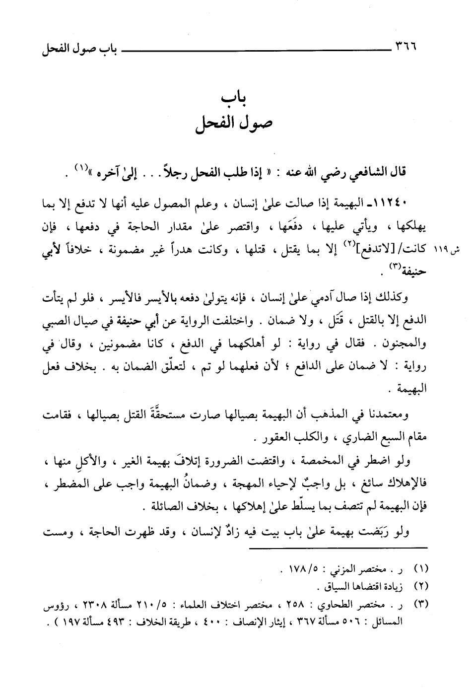 11240 - البهيمة إذا صالت على إنسان، وعلم المصول عليه أنها لا تدفع إلا بما يهلكها، ويأتي عليها، دفَعَها، واقتصر على مقدار الحاجة في دفعها، فإن كانت [لا تدفع] (2) إلا بما يقتل، قتلها، وكانت هدراً غير مضمونة، خلافاً لأبي حنيفة (3).