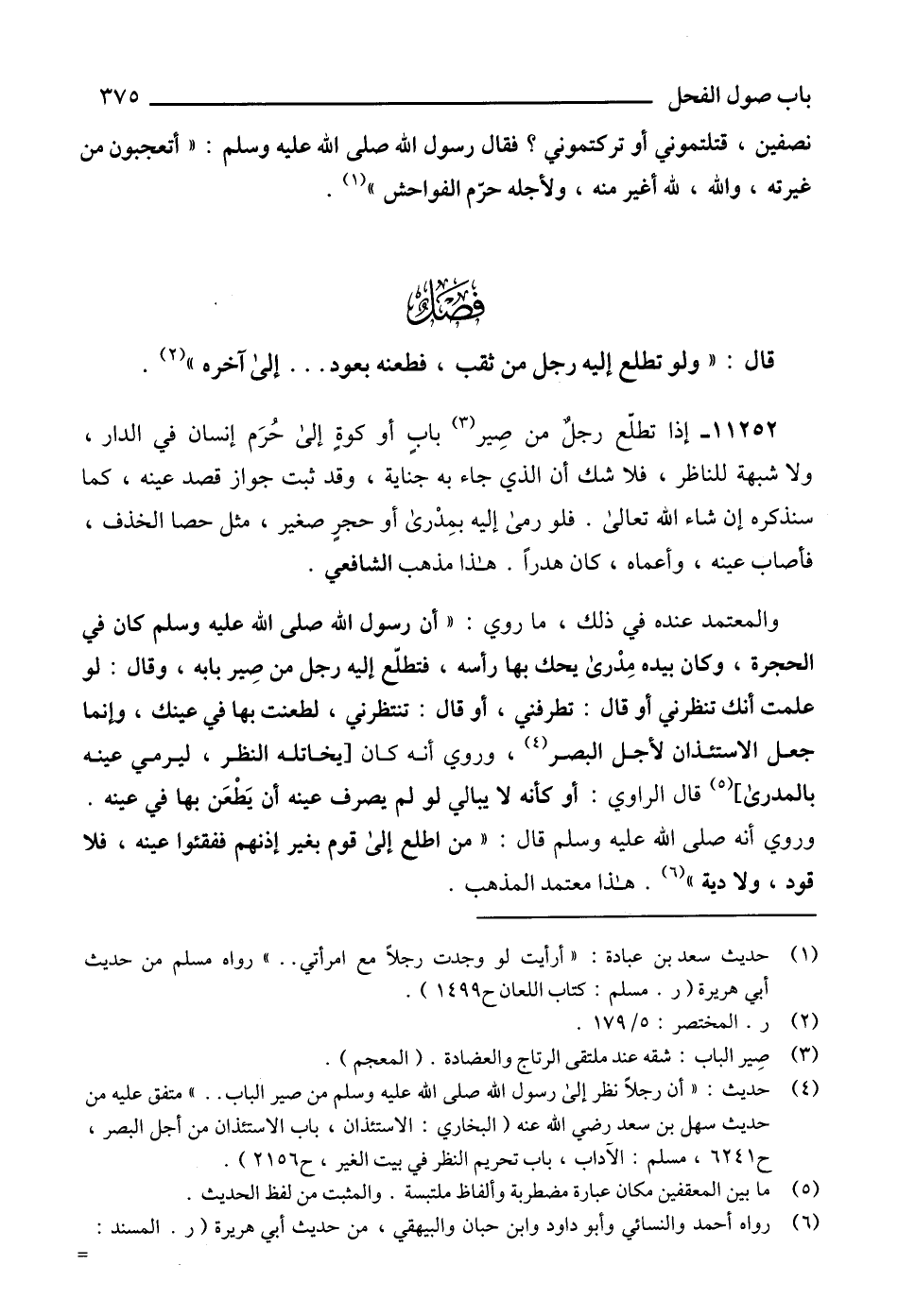 والمعتمد عنده في ذلك، ما روي: " أن رسول الله صلى الله عليه وسلم كان في الحجرة، وكان بيده مِدْرى يحك بها رأسه، فتطلّع إليه رجل من صِير بابه، وقال: لو علمت أنك تنظرني أو قال: تطرفني، أو قال: تنتظرني، لطعنت بها في عينك، وإنما جعل الاستئذان لأجل البصر (4)، وروي أنه كان [يخاتله النظر، ليرمي عينه بالمدرى] (5) قال الراوي: أو كأنه لا يبالي لو لم يصرف عينه أن يَطْعَن بها في عينه.