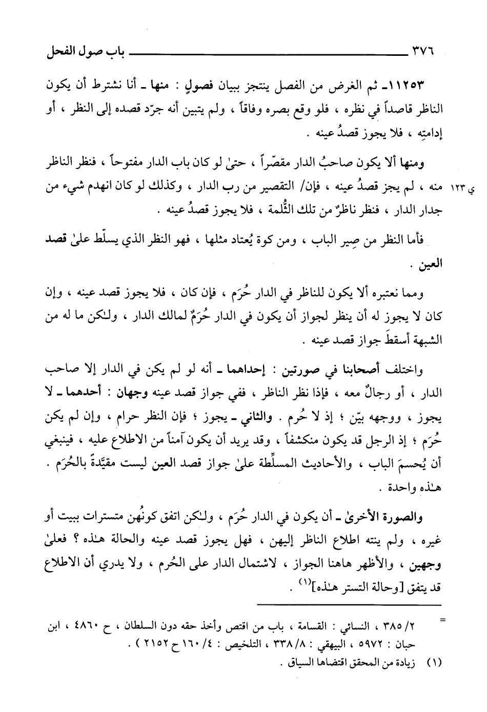 11253 - ثم الغرض من الفصل ينتجز ببيان فصولٍ: منها - أنا نشترط أن يكون الناظر قاصداً في نظره، فلو وقع بصره وفاقاً، ولم يتبين أنه جرّد قصده إلى النظر، أو إدامتِه، فلا يجوز قصدُ عينه.