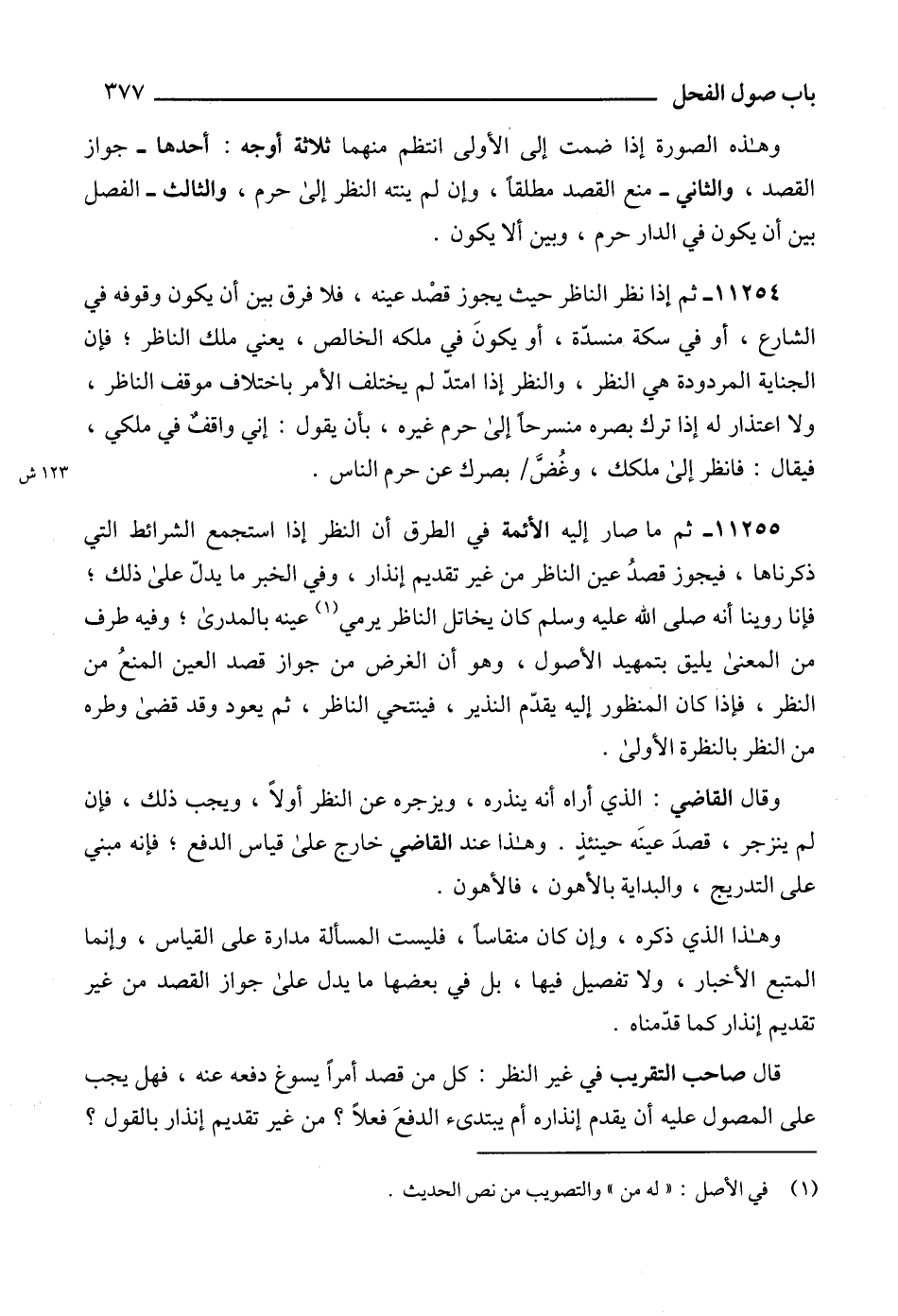 11254 - ثم إذا نظر الناظر حيث يجوز قصد عينه، فلا فرق بين أن يكون وقوفه في الشارع، أو في سكة منسدّة، أو يكونَ في ملكه الخالص، يعني ملك الناظر؛ فإن الجناية المردودة هي النظر، والنظر إذا امتدّ لم يختلف الأمر باختلاف موقف الناظر، ولا اعتذار له إذا ترك بصره منسرحاً إلى حرم غيره، بأن يقول: إني واقفٌ في ملكي، فيقال: فانظر إلى ملكك، وغُضَّ بصرك عن حرم الناس.