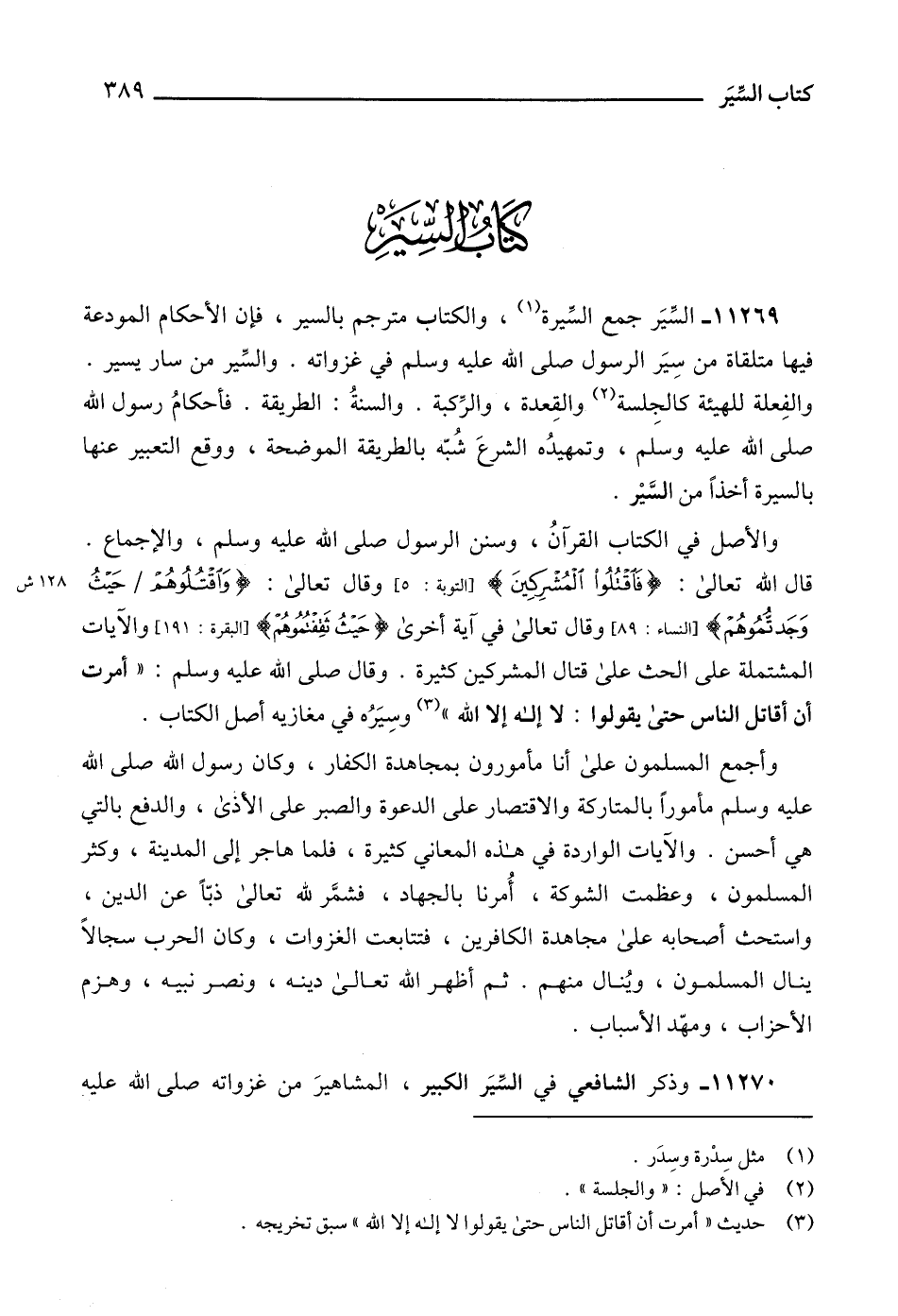 قال الله تعالى: {فَاقْتُلُوا الْمُشْرِكِينَ} [التوبة: 5]، وقال تعالى: {وَاقْتُلُوهُمْ حَيْثُ وَجَدْتُمُوهُمْ} [النساء: 89] وقال تعالى في آية أخرى {وَاقْتُلُوهُمْ حَيْثُ ثَقِفْتُمُوهُمْ} [البقرة: 191] والآيات المشتملة على الحث على قتال المشركين كثيرة. وقال صلى الله عليه وسلم: " أمرت أن أقاتل الناس حتى يقولوا: لا إله إلا الله " (3) وسِيَرُه في مغازيه أصل الكتاب.