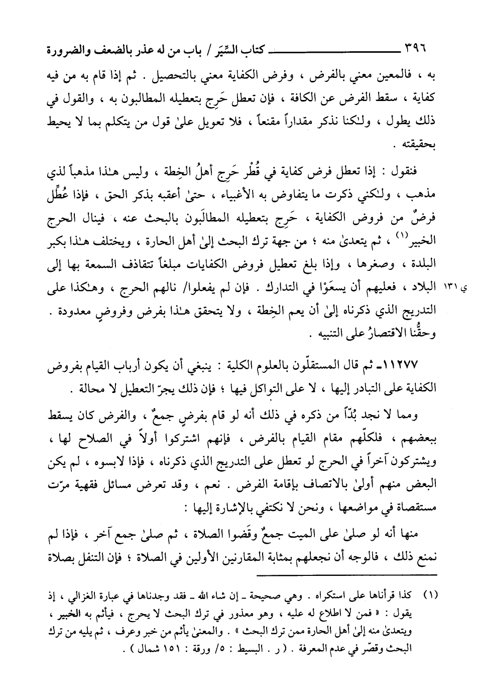 (1) كذا قرأناها على استكراه. وهي صحيحة -إن شاء الله- فقد وجدناها في عبارة الغزالي، إذ يقول: " فمن لا اطلاع له عليه، وهو معذور في ترك البحث لا يحرج، فيأثم به الخبير، ويتعدى منه إلى أهل الحارة ممن ترك البحث ". والمعنى يأثم من خبر وعرف، ثم يليه من ترك البحث وقصّر في عدم المعرفة. (ر. البسيط: 5/ورقة: 151 شمال).