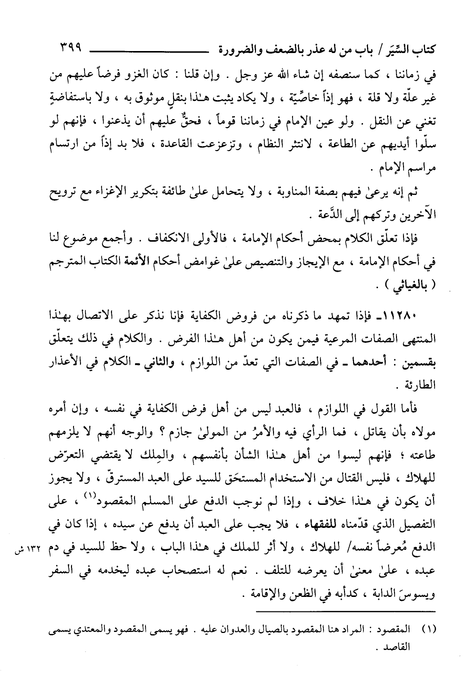 فأما القول في اللوازم، فالعبد ليس من أهل فرض الكفاية في نفسه، وإن أمره مولاه بأن يقاتل، فما الرأي فيه والأمرُ من المولى جازم؟ والوجه أنهم لا يلزمهم طاعته؛ فإنهم ليسوا من أهل هذا الشأن بأنفسهم، والمِلك لا يقتضي التعرّض للهلاك، فليس القتال من الاستخدام المستحَق للسيد على العبد المسترقّ، ولا يجوز أن يكون في هذا خلاف، وإذا لم نوجب الدفع على المسلم المقصود (1)، على التفصيل الذي قدّمناه للفقهاء، فلا يجب على العبد أن يدفع عن سيده، إذا كان في الدفع مُعرضاً نفسه للهلاك، ولا أثر للملك في هذا الباب، ولا حظ للسيد في دم عبده، على معنى أن يعرضه للتلف. نعم له استصحاب عبده ليخدمه في السفر ويسوسَ الدابة، كدأبه في الظعن والإقامة.