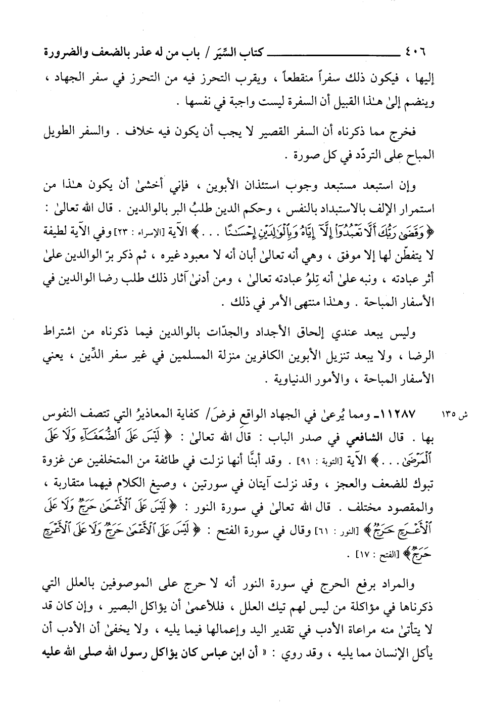 11287 - ومما يُرعى في الجهاد الواقعِ فرضَ كفاية المعاذيرُ التي تتصف النفوس بها. قال الشافعي في صدر الباب: قال الله تعالى: {لَيْسَ عَلَى الضُّعَفَاءِ وَلَا عَلَى الْمَرْضَى ... } الآية [التوبة: 91]. وقد أبنَّا أنها نزلت في طائفة من المتخلفين عن غزوة تبوك للضعف والعجز، وقد نزلت آيتان في سورتين، وصيغ الكلام فيهما متقاربة، والمقصود مختلف. قال الله تعالى في سورة النور: {لَيْسَ عَلَى الْأَعْمَى حَرَجٌ وَلَا عَلَى الْأَعْرَجِ حَرَجٌ} [النور: 61]، وقال في سورة الفتح: {لَيْسَ عَلَى الْأَعْمَى حَرَجٌ وَلَا عَلَى الْأَعْرَجِ حَرَجٌ} [الفتح: 17].
