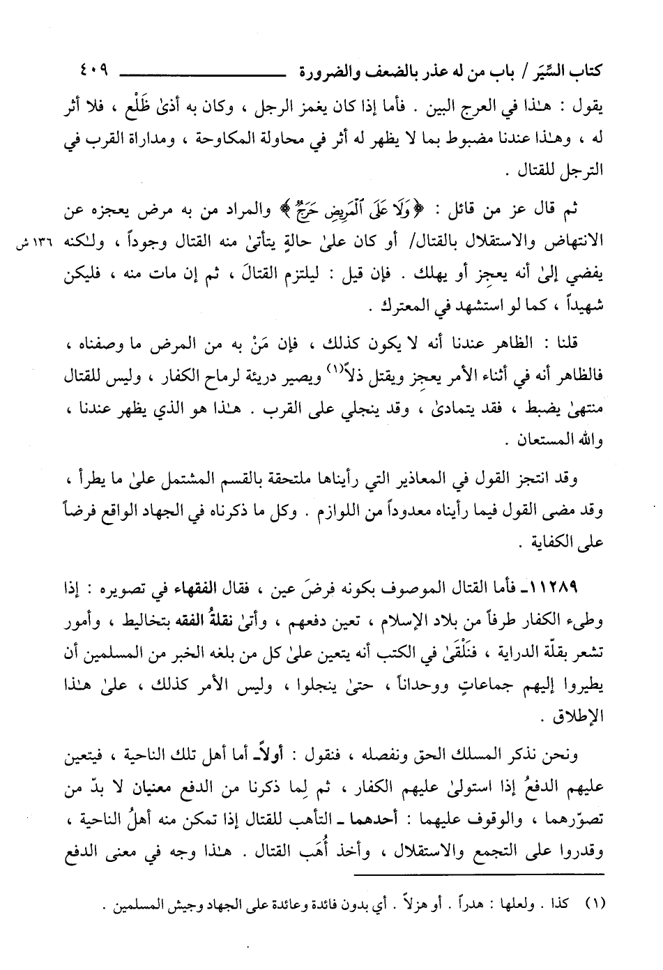 وقد انتجز القول في المعاذير التي رأيناها ملتحقة بالقسم المشتمل على ما يطرأ، وقد مضى القول فيما رأيناه معدوداً من اللوازم. وكل ما ذكرناه في الجهاد الواقع فرضاً على الكفاية.