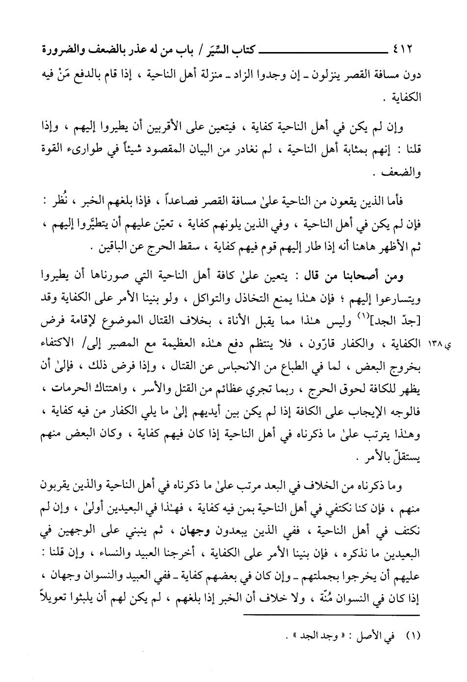 ومن أصحابنا من قال: يتعين على كافة أهل الناحية التي صورناها أن يطيروا ويتسارعوا إليهم؛ فإن هذا يمنع التخاذل والتواكل، ولو بنينا الأمر على الكفاية وقد [جدّ الجد] (1) وليس هذا مما يقبل الأناة، بخلاف القتال الموضوع لإقامة فرض الكفاية، والكفار قارّون، فلا ينتظم دفع هذه العظيمة مع المصير إلى الاكتفاء بخروج البعض، لما في الطباع من الانحباس عن القتال، وإذا فرض ذلك، فإلى أن يظهر للكافة لحوق الحرج، ربما تجري عظائم من القتل والأسر، واهتتاك الحرمات، فالوجه الإيجاب على الكافة إذا لم يكن بين أيديهم إلى ما يلي الكفار من فيه كفاية، وهذا يترتب على ما ذكرناه في أهل الناحية إذا كان فيهم كفاية، وكان البعض منهم يستقلّ بالأمر.