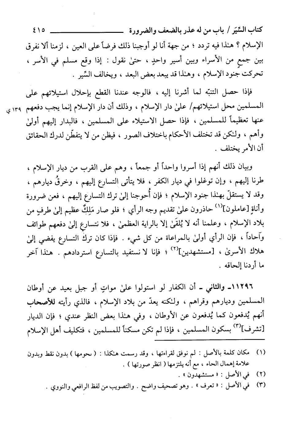 وبيان ذلك أنهم إذا أسروا واحداً أو جمعاً، وهم على القرب من ديار الإسلام، طرنا إليهم، وإن توغلوا في ديار الكفر، فلا يتأتى التسارع إليهم، وخرقُ ديارهم، وقد لا يستقلّ بهذا جنود الإسلام؛ فإن أُحوجنا إلى ترك التسارع إليهم، فعن ضرورة وأناةٍ [عاملون] (1) حاذرون على تقديم وجه الرأي؛ فلو صار مَلِكٌ عظيم إلى طرفٍ من بلاد الإسلام، وعلمنا أنه لا يُلقَى إلا بالراية العظمى، فلا نتسارج إلى دفعهم طوائف وآحاداً، فإن الرأي أولى بالمراعاة من كل شيء. فإذا كان ترك التسارع يفضي إلى هلاك الأسرى، [مستشهدين] (2)؛ فإنا لا نستفيد بالتسارع استردادهم. هذا آخر ما أردنا إلحاقه.