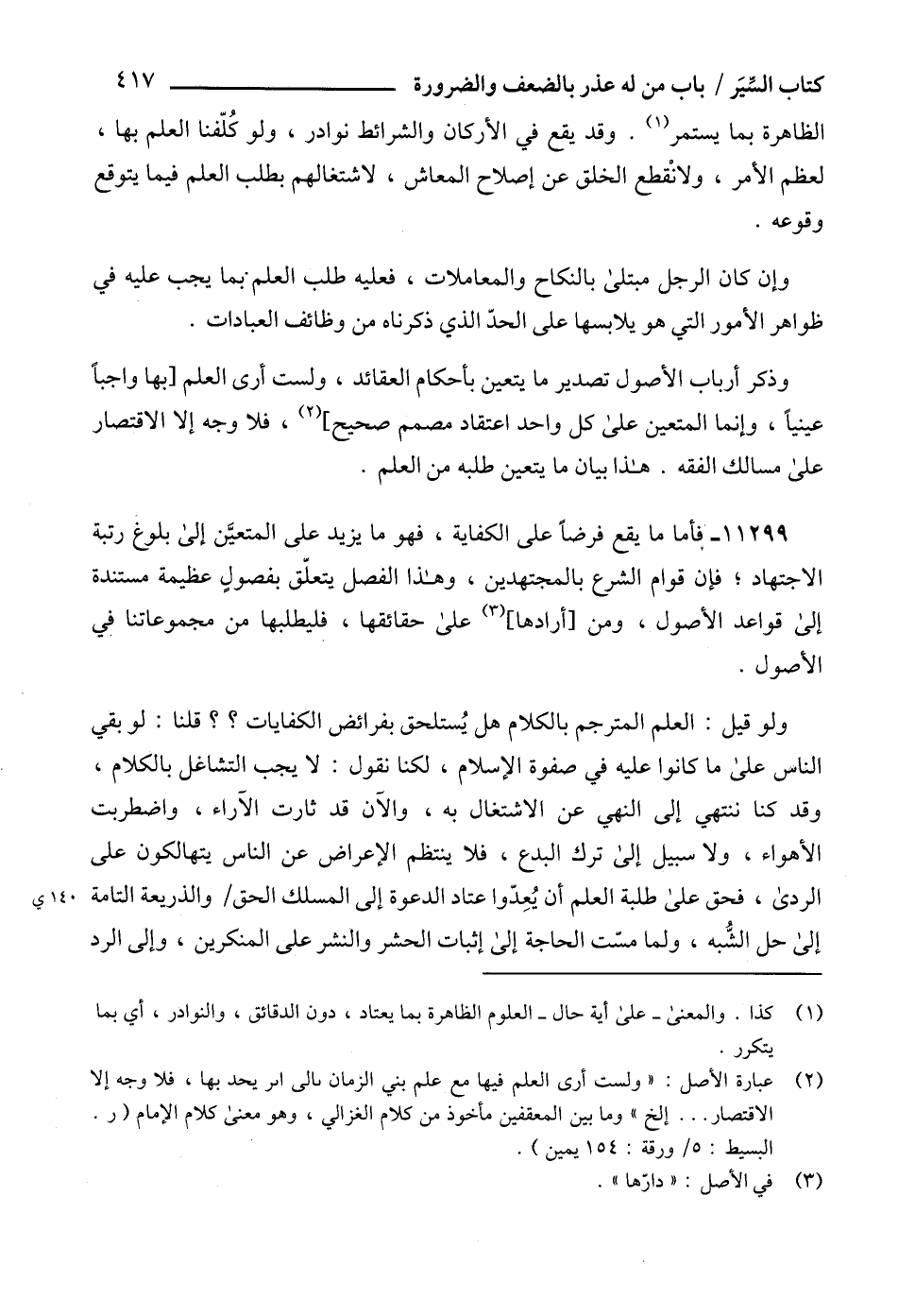 (2) عبارة الأصل: " ولست أرى العلم فيها مع علم بني الزمان ـالى ار يحد بها، فلا وجه إلا الاقتصار ... إلخ " وما بين المعقفين مأخوذ من كلام الغزالي، وهو معنى كلام الإمام (ر. البسيط: 5/ورقة: 154 يمين).