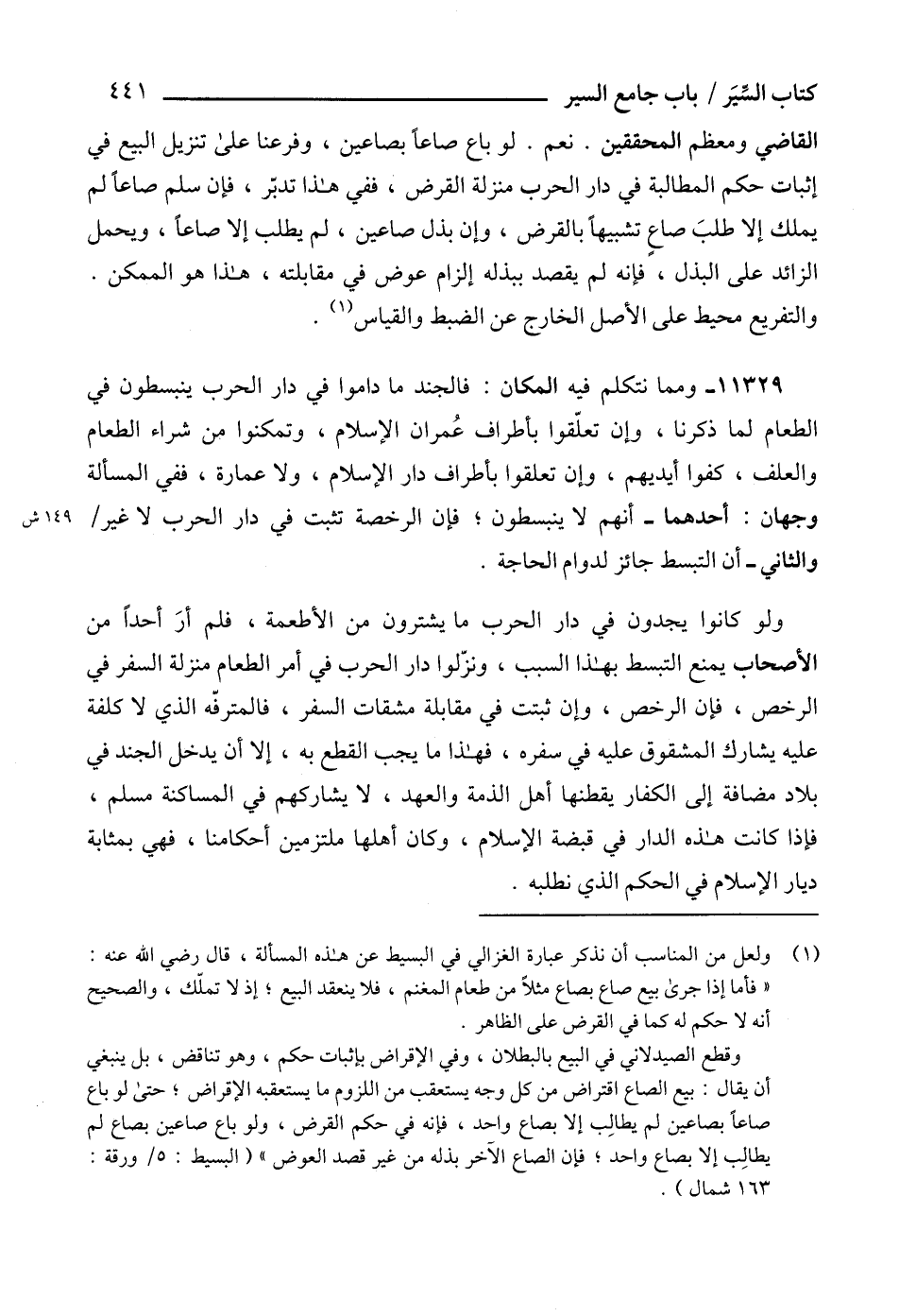القاضي ومعظم المحققين. نعم. لو باع صاعاً بصاعين، وفرعنا على تنزيل البيع في إثبات حكم المطالبة في دار الحرب منزلة القرض، ففي هذا تدبّر، فإن سلم صاعاً لم يملك إلا طلبَ صاعٍ تشبيهاً بالقرض، وإن بذل صاعين، لم يطلب إلا صاعاً، ويحمل الزائد على البذل، فإنه لم يقصد ببذله إلزام عوض في مقابلته، هذا هو الممكن.