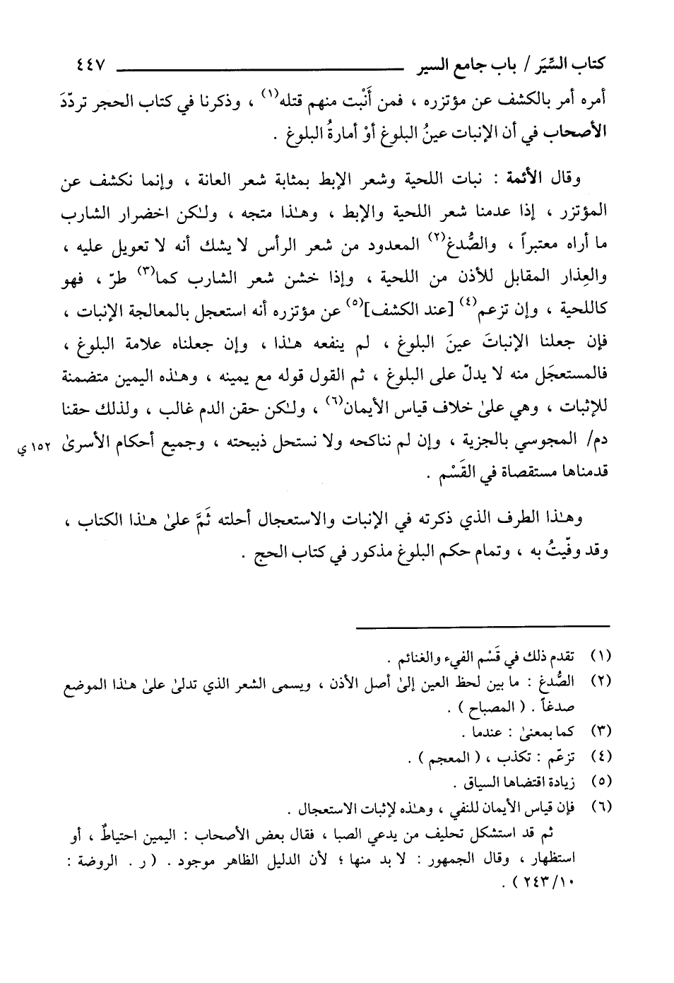 وقال الأئمة: نبات اللحية وشعر الإبط بمثابة شعر العانة، وإنما نكشف عن المؤتزر، إذا عدمنا شعر اللحية والإبط، وهذا متجه، ولكن اخضرار الشارب ما أراه معتبراً، والصُّدغ (2) المعدود من شعر الرأس لا يشك أنه لا تعويل عليه، والعِذار المقابل للأذن من اللحية، وإذا خشن شعر الشارب كما (3) طرّ، فهو كاللحية، وإن تزعم (4) [عند الكشف] (5) عن مؤتزره أنه استعجل بالمعالجة الإنبات، فإن جعلنا الإنباتَ عينَ البلوغ، لم ينفعه هذا، وإن جعلناه علامة البلوغ، فالمستعجَل منه لا يدلّ على البلوغ، ثم القول قوله مع يمينه، وهذه اليمين متضمنة للإثبات، وهي على خلاف قياس الأيمان (6)، ولكن حقن الدم غالب، ولذلك حقنا دم المجوسي بالجزية، وإن لم نناكحه ولا نستحل ذبيحته، وجميع أحكام الأسرى قدمناها مستقصاة في القَسْم.