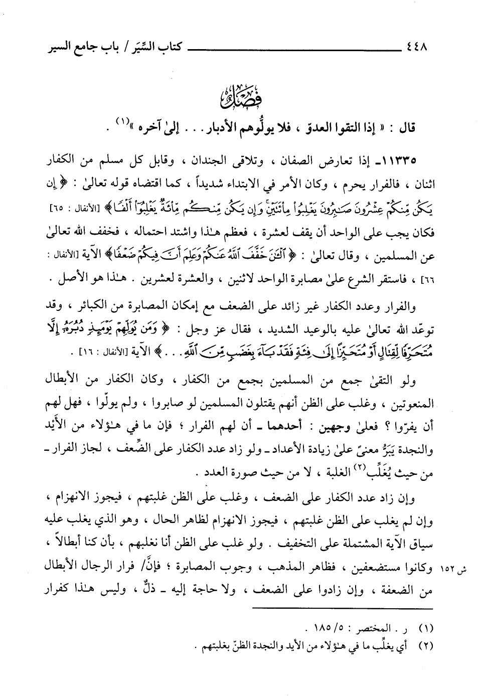 11335 - إذا تعارض الصفان، وتلاقى الجندان، وقابل كل مسلم من الكفار اثنان، فالفرار يحرم، وكان الأمر في الابتداء شديداً، كما اقتضاه قوله تعالى: {إِنْ يَكُنْ مِنْكُمْ عِشْرُونَ صَابِرُونَ يَغْلِبُوا مِائَتَيْنِ وَإِنْ يَكُنْ مِنْكُمْ مِئَةٌ يَغْلِبُوا أَلْفًا} [الأنفال: 65]، فكان يجب على الواحد أن يقف لعشرة، فعظم هذا واشتد احتماله، فخفف الله تعالى عن المسلمين، وقال تعالى: {الْآَنَ خَفَّفَ اللَّهُ عَنْكُمْ وَعَلِمَ أَنَّ فِيكُمْ ضَعْفًا} [الأنفال: 66]، فاستقر الشرع على مصابرة الواحد لاثنين، والعشرة لعشرين. هذا هو الأصل.