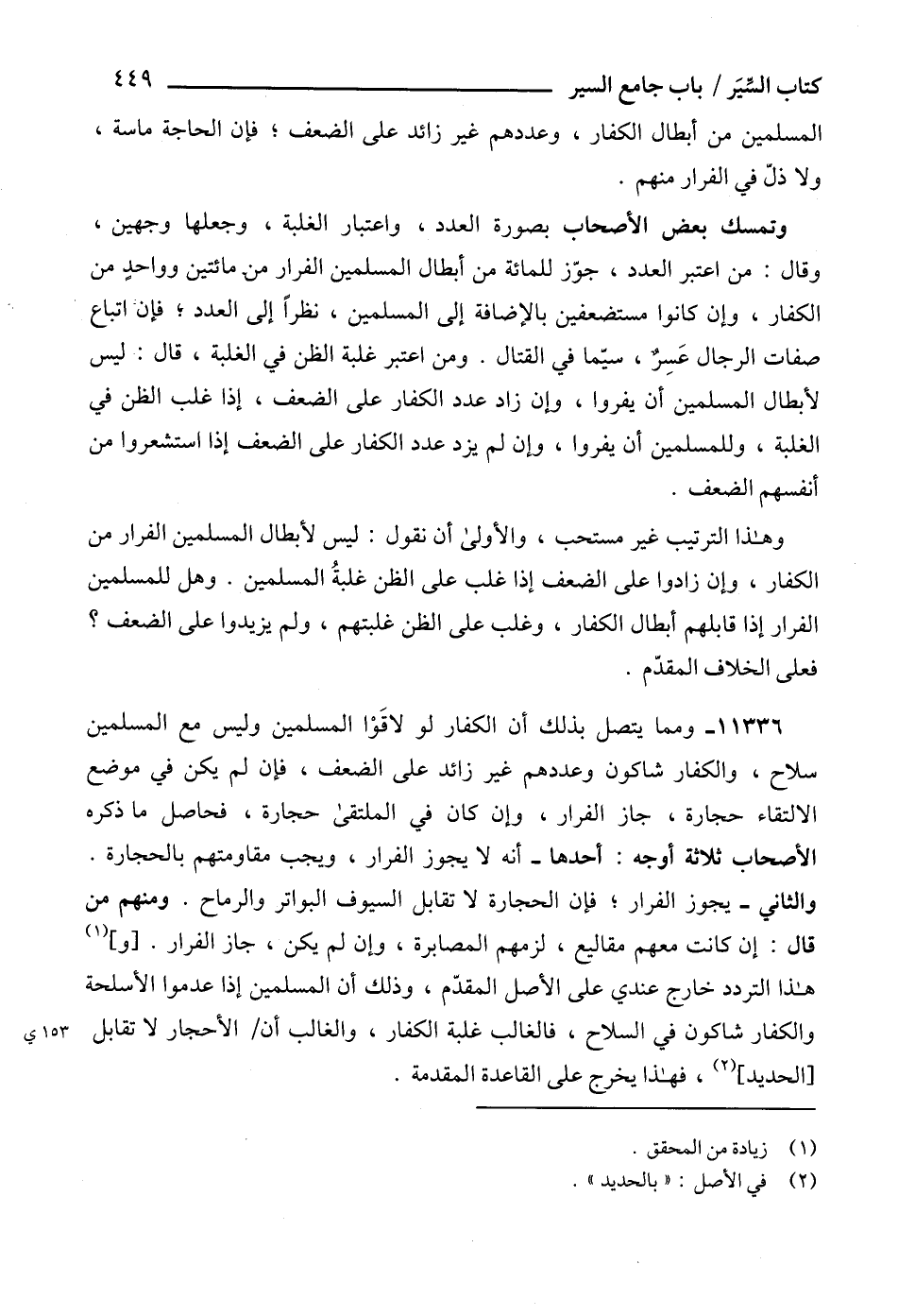 وتمسك بعض الأصحاب بصورة العدد، واعتبار الغلبة، وجعلها وجهين، وقال: من اعتبر العدد، جوّز للمائة من أبطال المسلمين الفرار من مائتين وواحدٍ من الكفار، وإن كانوا مستضعفين بالإضافة إلى المسلمين، نظراً إلى العدد؛ فإن اتباع صفات الرجال عَسِرٌ، سيّما في القتال. ومن اعتبر غلبة الظن في الغلبة، قال: ليس لأبطال المسلمين أن يفروا، وإن زاد عدد الكفار على الضعف، إذا غلب الظن في الغلبة، وللمسلمين أن يفروا، وإن لم يزد عدد الكفار على الضعف إذا استشعروا من أنفسهم الضعف.