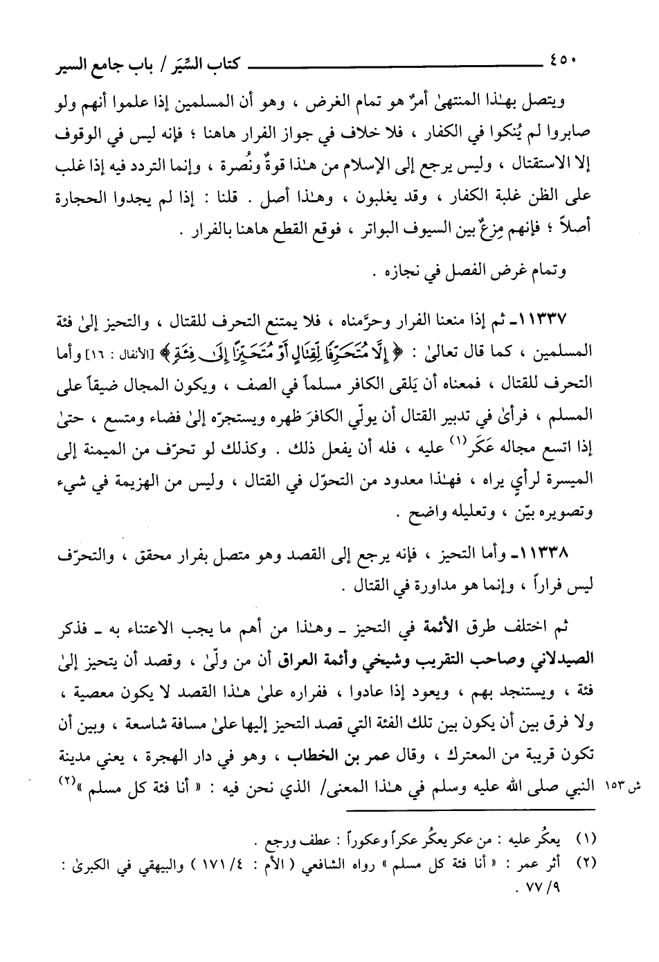 11337 - ثم إذا منعنا الفرار وحرَّمناه، فلا يمتنع التحرف للقتال، والتحيز إلى فئة المسلمين، كما قال تعالى: {إِلَّا مُتَحَرِّفًا لِقِتَالٍ أَوْ مُتَحَيِّزًا إِلَى فِئَةٍ} [الأنفال: 16]، وأما التحرف للقتال، فمعناه أن يَلقى الكافر مسلماً في الصف، ويكون المجال ضيقاً على المسلم، فرأى في تدبير القتال أن يولّي الكافرَ ظهره ويستجرّه إلى فضاء ومتسع، حتى إذا اتسع مجاله عَكَر (1) عليه، فله أن يفعل ذلك. وكذلك لو تحرّف من الميمنة إلى الميسرة لرأيٍ يراه، فهذا معدود من التحوّل في القتال، وليس من الهزيمة في شيء وتصويره بيّن، وتعليله واضح.