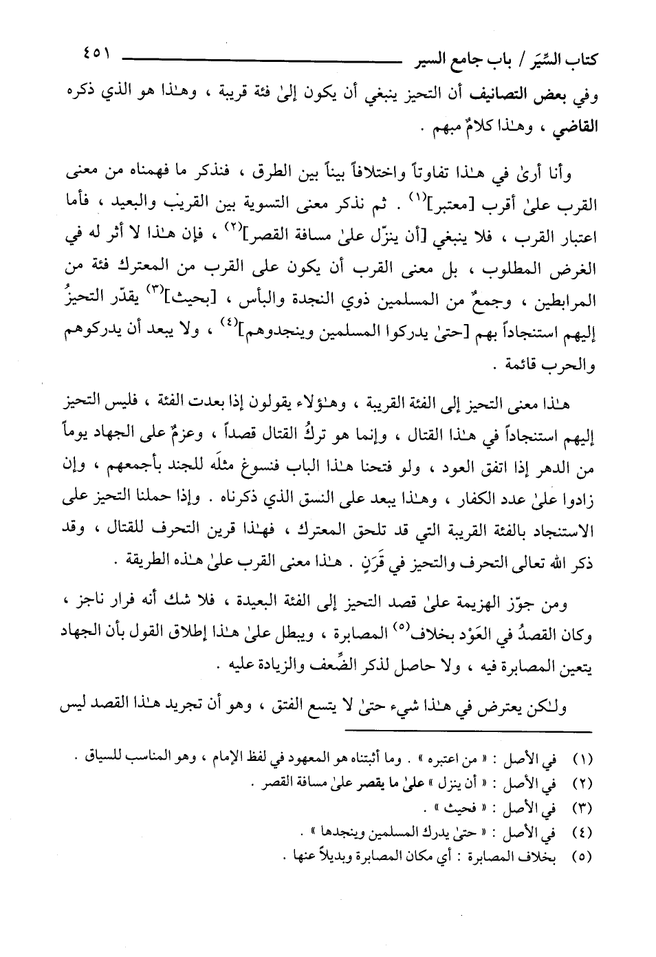 وأنا أرى في هذا تفاوتاً واختلافاً بيناً بين الطرق، فنذكر ما فهمناه من معنى القرب على أقرب [معتبر] (1). ثم نذكر معنى التسوية بين القريب والبعيد، فأما اعتبار القرب، فلا ينبغي [أن ينزّل على مسافة القصر] (2)، فإن هذا لا أثر له في الغرض المطلوب، بل معنى القرب أن يكون على القرب من المعترك فئة من المرابطين، وجمعٌ من المسلمين ذوي النجدة والبأس، [بحيث] (3) يقدّر التحيزُ إليهم استنجاداً بهم [حتى يدركوا المسلمين وينجدوهم] (4)، ولا يبعد أن يدركوهم والحرب قائمة.