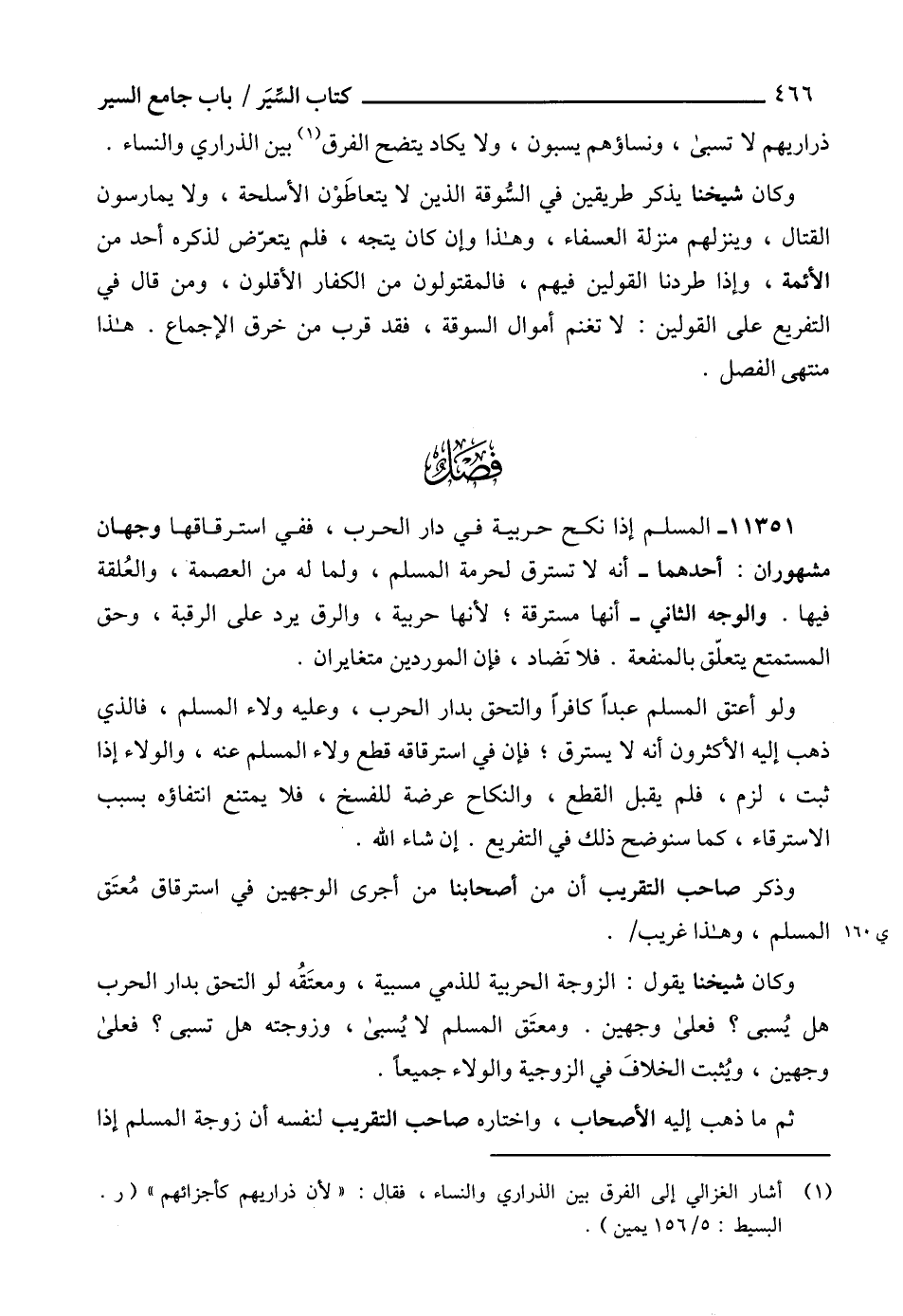 11351 - المسلم إذا نكح حربية في دار الحرب، ففي استرقاقها وجهان مشهوران: أحدهما - أنه لا تسترق لحرمة المسلم، ولما له من العصمة، والعُلقة فيها. والوجه الثاني - أنها مسترقة؛ لأنها حربية، والرق يرد على الرقبة، وحق المستمتع يتعلّق بالمنفعة. فلا تَضاد، فإن الموردين متغايران.