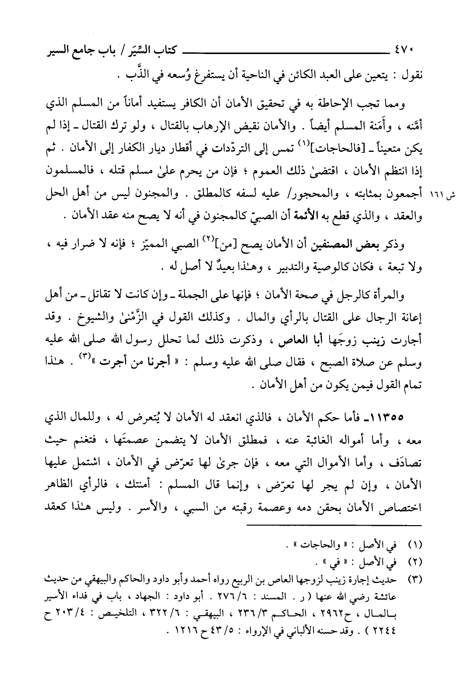 والمرأة كالرجل في صحة الأمان، فإنها على الجملة -وإن كانت لا تقاتل- من أهل إعانة الرجال على القتال بالرأي والمال. وكذلك القول في الزَّمْنى والشيوخ. وقد أجارت زينب زوجَها أبا العاص، وذكرت ذلك لما تحلل رسول الله صلى الله عليه وسلم عن صلاة الصبح، فقال صلى الله عليه وسلم: " أجرنا من أجرت " (3). هذا تمام القول فيمن يكون من أهل الأمان.