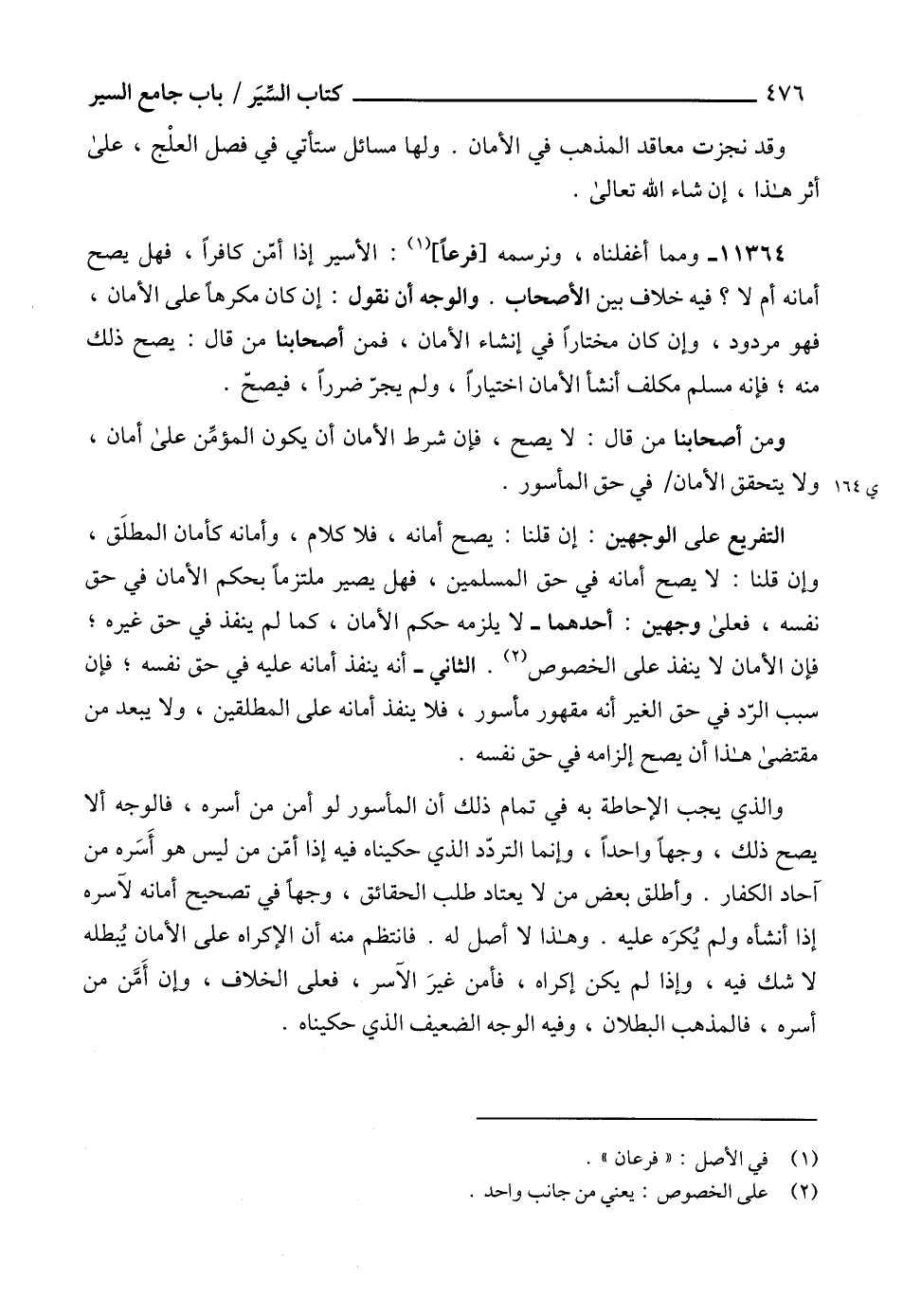 التفريع على الوجهين: إن قلنا: يصح أمانه، فلا كلام، وأمانه كأمان المطلَق، وإن قلنا: لا يصح أمانه في حق المسلمين، فهل يصير ملتزماً بحكم الأمان في حق نفسه، فعلى وجهين: أحدهما - لا يلزمه حكم الأمان، كما لم ينفذ في حق غيره؛ فإن الأمان لا ينفذ على الخصوص (2). الثاني - أنه ينفذ أمانه عليه في حق نفسه؛ فإن سبب الرّد في حق الغير أنه مقهور مأسور، فلا ينفذ أمانه على المطلقين، ولا يبعد من مقتضى هذا أن يصح إلزامه في حق نفسه.