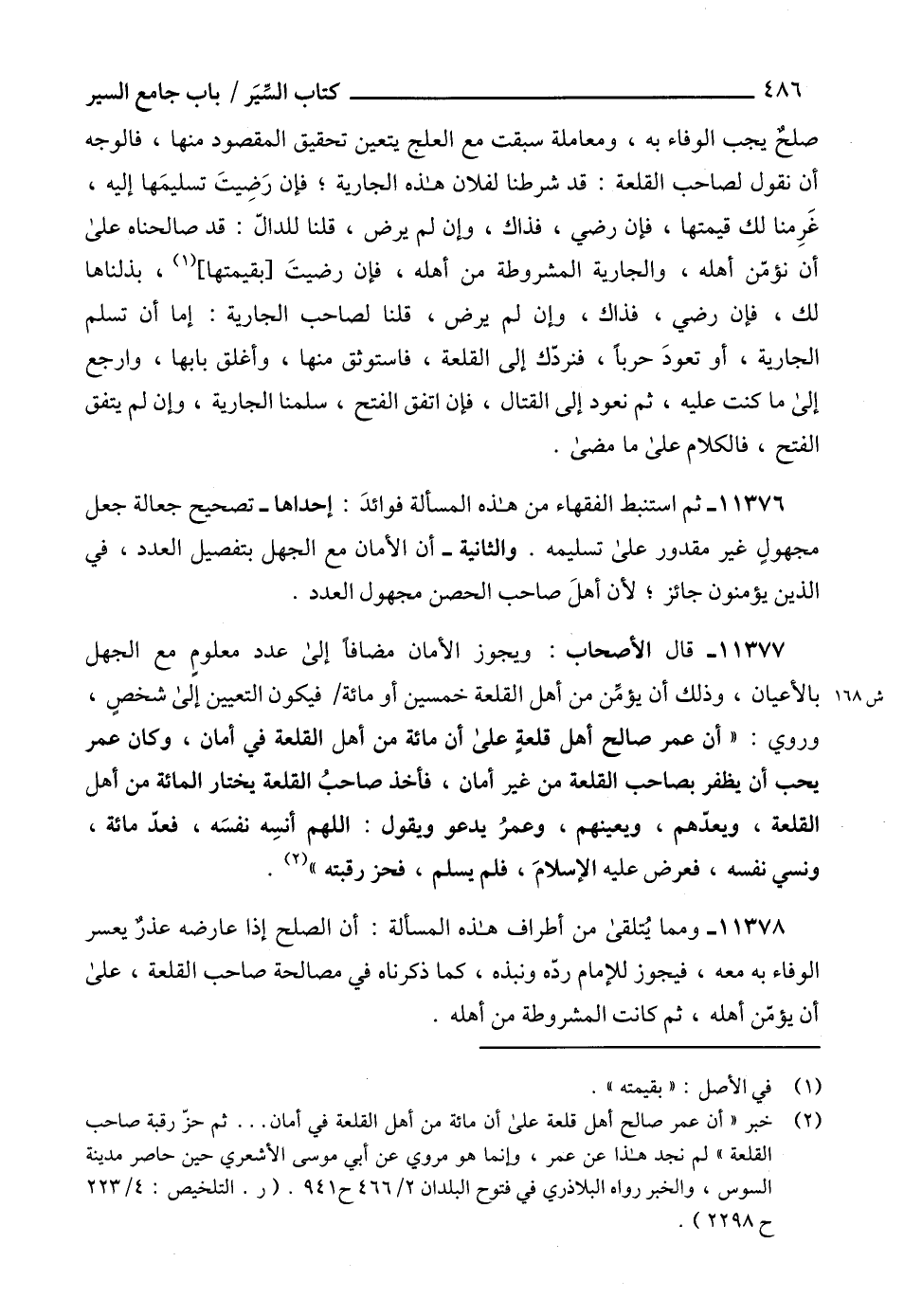 11377 - قال الأصحاب: ويجوز الأمان مضافاً إلى عدد معلومٍ مع الجهل بالأعيان، وذلك أن يؤمِّن من أهل القلعة خمسين أو مائة فيكون التعيين إلى شخصٍ، وروي: " أن عمر صالح أهل قلعةٍ على أن مائة من أهل القلعة في أمان، وكان عمر يحب أن يظفر بصاحب القلعة من غير أمان، فأخذ صاحبُ القلعة يختار المائة من أهل القلعة، ويعدّهم، ويعينهم، وعمرُ يدعو ويقول: اللهم أنسِه نفسَه، فعدّ مائة، ونسي نفسه، فعرض عليه الإسلامَ، فلم يسلم، فحز رقبته " (2).