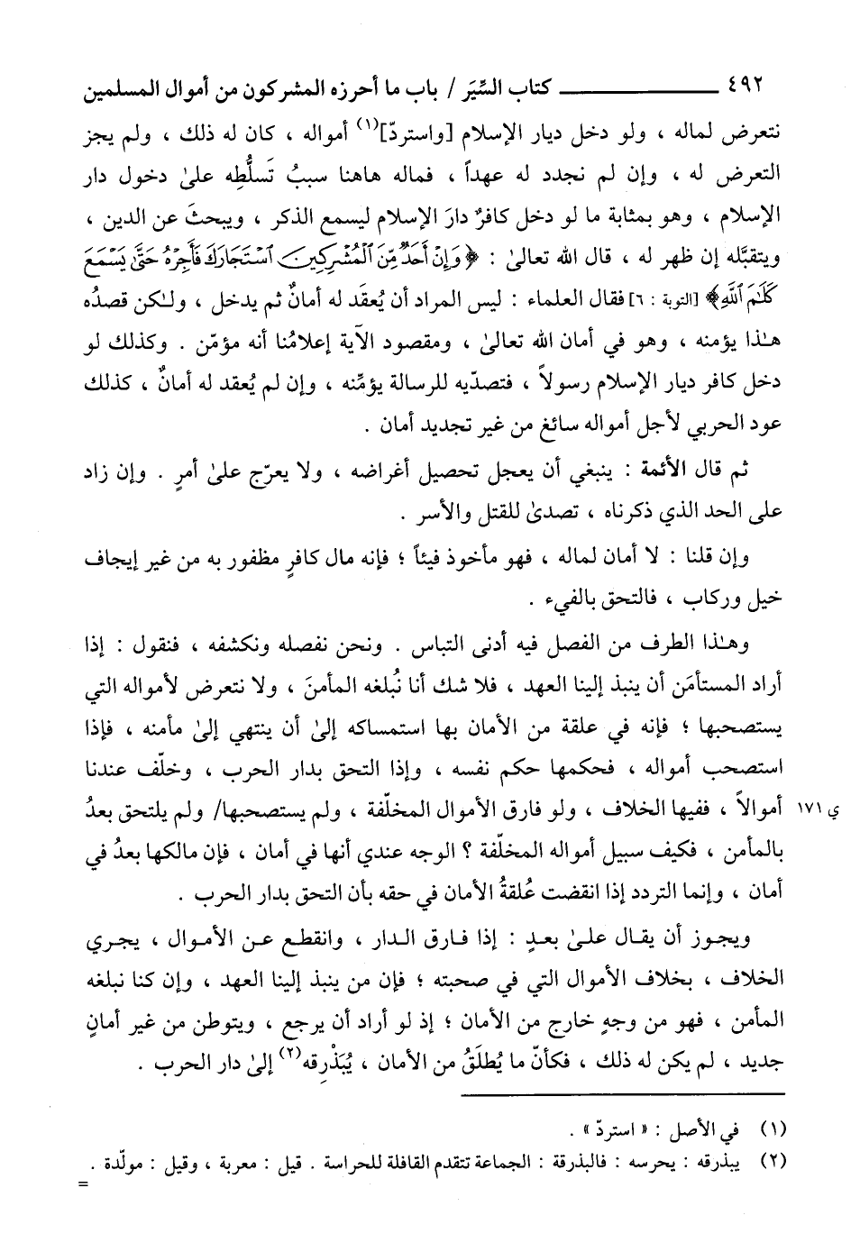 نتعرض لماله، ولو دخل ديار الإسلام [واستردّ] (1) أمواله، كان له ذلك، ولم يجز التعرض له، وإن لم نجدد له عهداً، فماله هاهنا سببُ تَسلُّطِه على دخول دار الإسلام، وهو بمثابة ما لو دخل كافرٌ دارَ الإسلام ليسمع الذكر، ويبحثَ عن الدين، ويتقبَّله إن ظهر له، قال الله تعالى: {وَإِنْ أَحَدٌ مِنَ الْمُشْرِكِينَ اسْتَجَارَكَ فَأَجِرْهُ حَتَّى يَسْمَعَ كَلَامَ} [التوبة: 6]، فقال العلماء: ليس المراد أن يُعقَد له أمانٌ ثم يدخل، ولكن قصدُه هذا يؤمنه، وهو في أمان الله تعالى، ومقصود الآية إعلامُنا أنه مؤمّن. وكذلك لو دخل كافر ديار الإسلام رسولاً، فتصدّيه للرسالة يؤمِّنه، وإن لم يُعقد له أمانٌ، كذلك عود الحربي لأجل أمواله سائغ من غير تجديد أمان.
