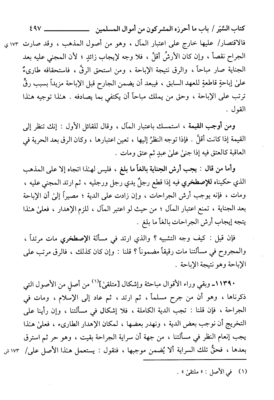 فالاقتصار عليها خارج على اعتبار المآل، وهو من أصول المذهب، وقد صارت الجراح نقصاً، وإن كان الأرشُ أقلَّ، فلا وجه لإيجاب زائدٍ؛ لأن المجني عليه بعد الجناية صار مباحاً، والرق نتيجة الإباحة، ومن استحق الرقَّ، فاستحقاقه طارئٌ على إباحةٍ قاطعةٍ للعهد السابق، فيبعد أن يضمن الجارح قبل الإباحة مزيداً بسبب رقٍّ ترتب على الإباحة، وحق من يملك مباحاً أن يكتفي بما يصادفه. هذا توجيه هذا القول.