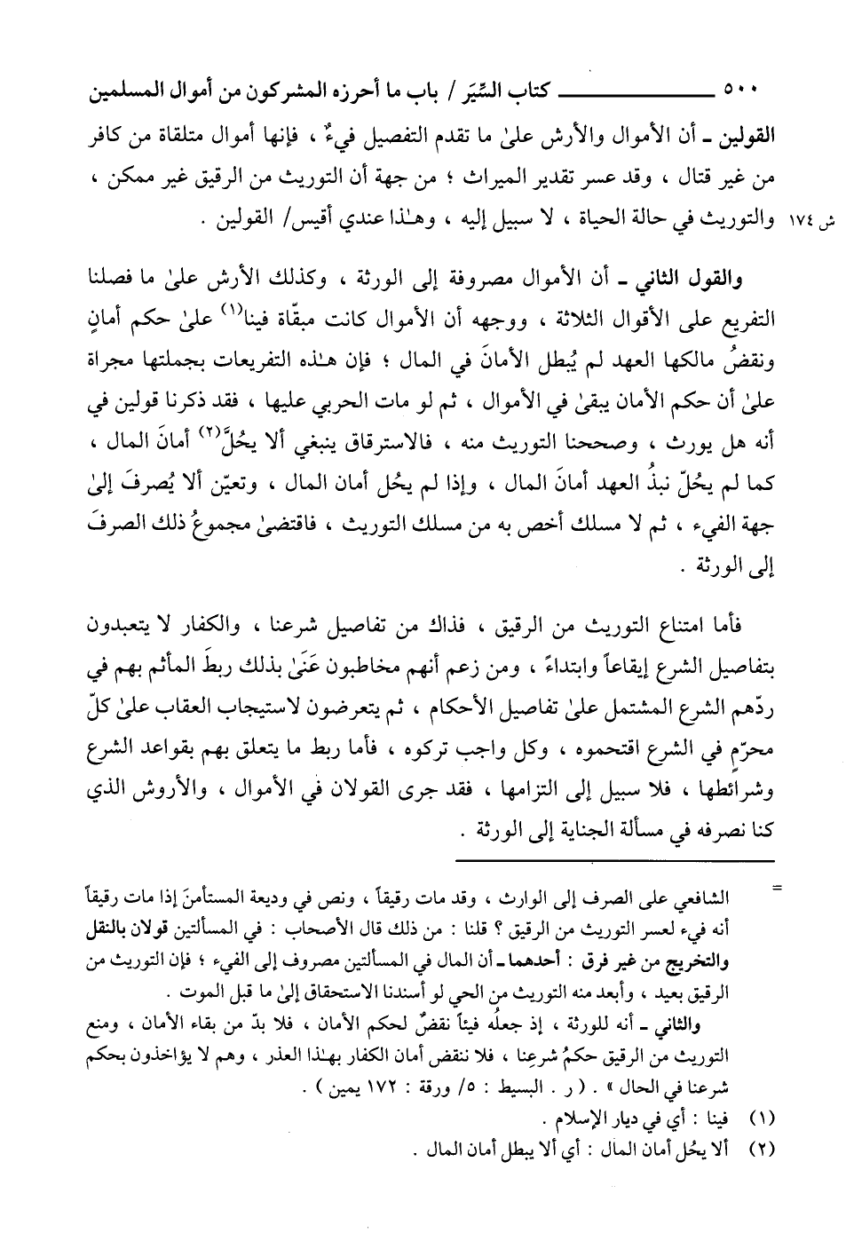 والثاني - أنه للورثة، إذ جعلُه فيئاً نقضٌ لحكم الأمان، فلا بدّ من بقاء الأمان، ومنع التوريث من الرقيق حكمُ شرعِنا، فلا ننقض أمان الكفار بهذا العذر، وهم لا يؤاخذون بحكم شرعنا في الحال ". (ر. البسيط: 5/ورقة: 172 يمين).