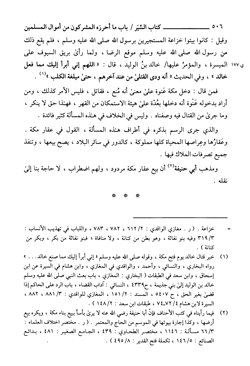 (1) خبر قتال خالد يوم فتح مكة، وقوله صلى الله عليه وسلم " إني أبرأ إليك مما صنع خالد ... " رواه البخاري، والنسائي، وأحمد، والواقدي في المغازي، وابن هشام في السيرة عن ابن إسحاق، وابن سعد في الطبقات (البخاري: المغازي، باب بعث النبي صلى الله عليه وسلم خالد بن الوليد إلى بني جذيمة، ح 4339، النسائي: آداب القضاء، باب الرد على الحاكم إذا قضى بغير الحق، ح 5407، المسند: 2/ 151، المغازي للواقدي: 3/ 881، 882، السيرة لابن هشام 4/ 72 - 74، طبقات ابن سعد: 2/ 148).