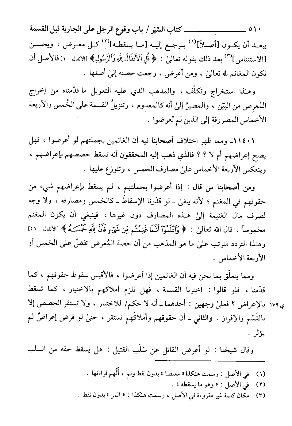 يبعد أن يكون [أصلاً] (1) يرجع إليه [ما يسقطه] (2) كل معرض، ويحسن [الاستئناس] (3) بعد ذلك بقوله تعالى: {قُلِ الْأَنْفَالُ لِلَّهِ وَالرَّسُولِ} [الأنفال: 1]، فالأصل أن تكون المغانم لله تعالى، ومن أعرض، رجعت حصته إلى أصلها.