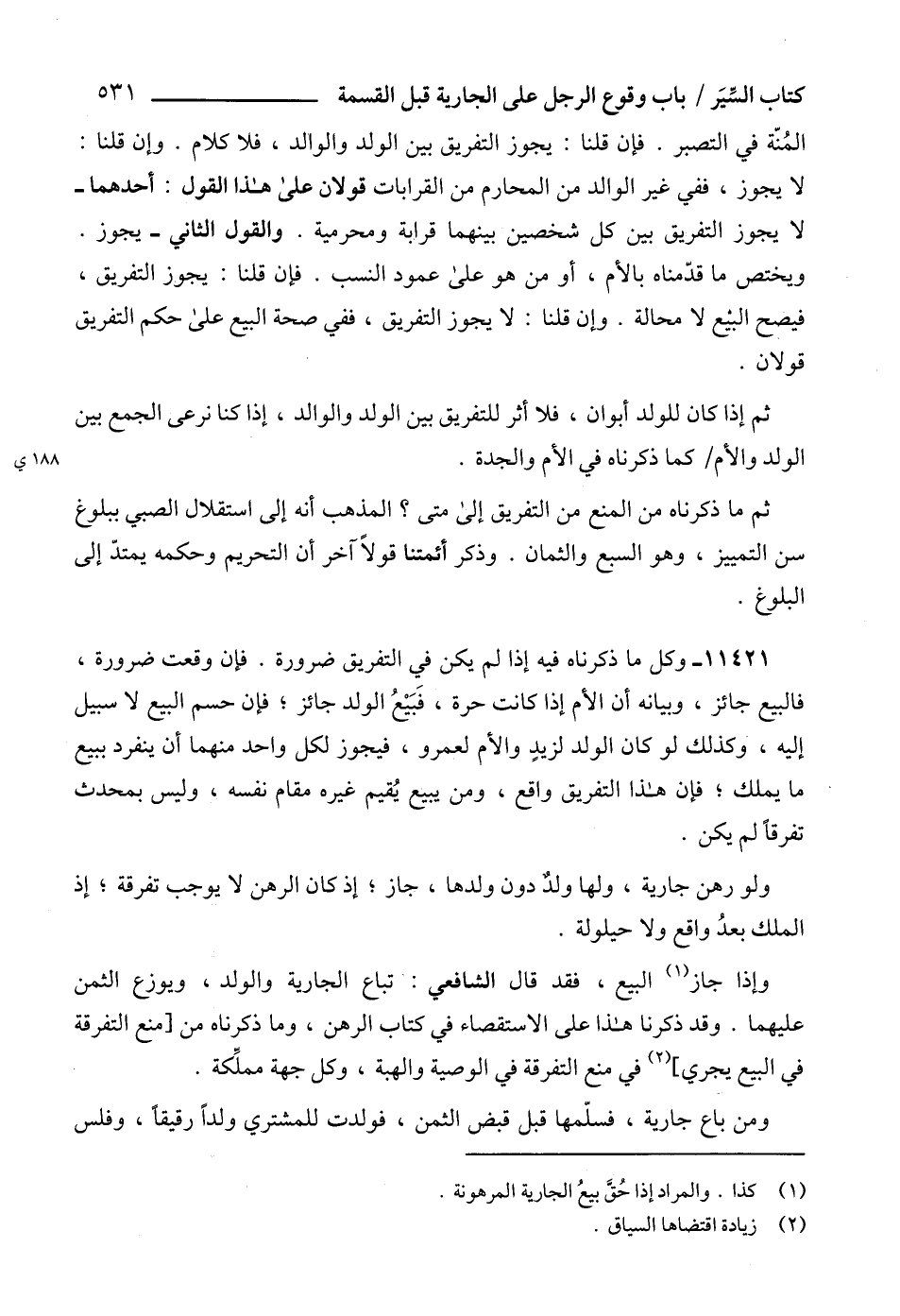 11421 - وكل ما ذكرناه فيه إذا لم يكن في التفريق ضرورة. فإن وقعت ضرورة، فالبيع جائز، وبيانه أن الأم إذا كانت حرة، فَبَيْعُ الولد جائز، فإن حسم البيع لا سبيل إليه، وكذلك لو كان الولد لزيدٍ والأم لعمرو، فيجوز لكل واحد منهما أن ينفرد ببيع ما يملك؛ فإن هذا التفريق واقع، ومن يبيع يُقيم غيره مقام نفسه، وليس بمحدث تفرقاً لم يكن.