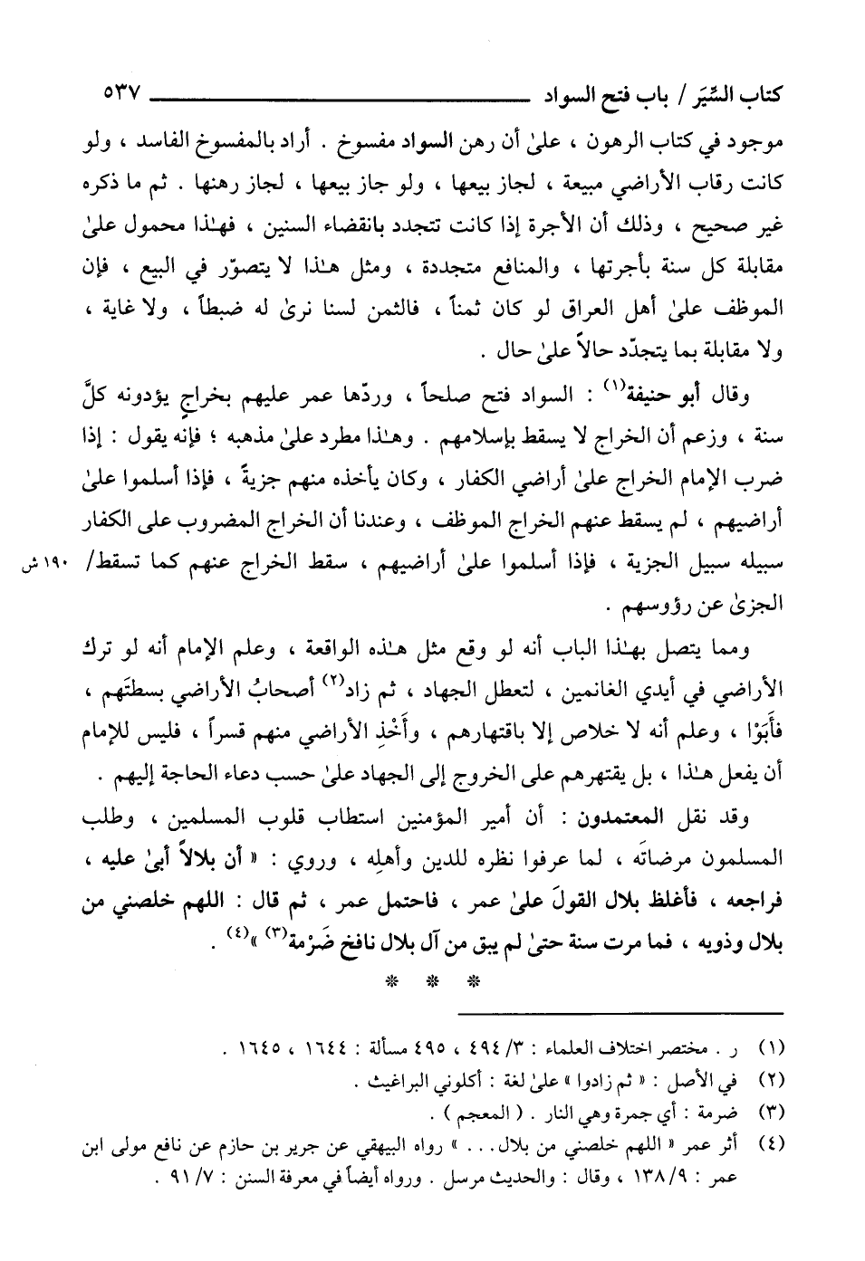 موجود في كتاب الرهون، على أن رهن السواد مفسوخ. أراد بالمفسوخ الفاسد، ولو كانت رقاب الأراضي مبيعة، لجاز بيعها، ولو جاز بيعها، لجاز رهنها. ثم ما ذكره غير صحيح، وذلك أن الأجرة إذا كانت تتجدد بانقضاء السنين، فهذا محمول على مقابلة كل سنة بأجرتها، والمنافع متجددة، ومثل هذا لا يتصوّر في البيع، فإن الموظف على أهل العراق لو كان ثمناً، فالثمن لسنا نرى له ضبطاً، ولا غاية، ولا مقابلة بما يتجدّد حالاً على حال.