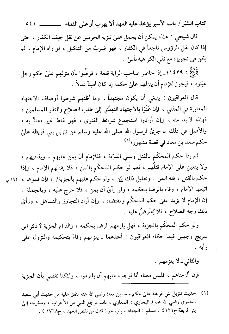 (1) حديث تنزيل بني قريظة على حكم سعد بن معاذ رضي الله عنه متفق عليه من حديث أبي سعيد الخدري رضي الله عنه (البخاري: المغازي، باب مرجع النبي من الأحزاب، ومخرجه إلى بني قريظة ح 4121. مسلم: الجهاد، باب جواز قتال من نقض العهد، ح 1768).
