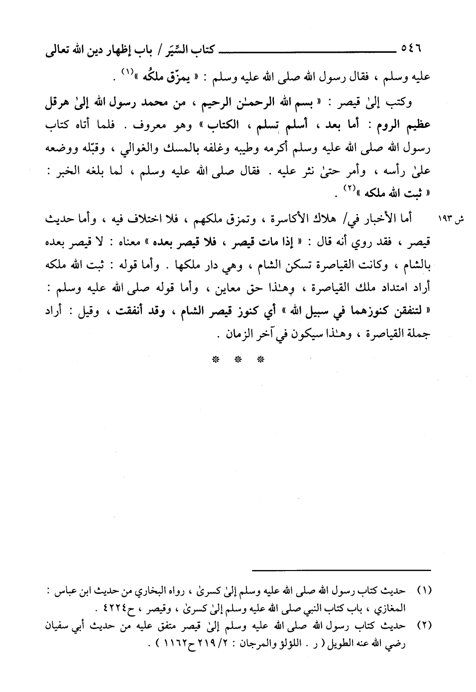 أما الأخبار في هلاك الأكاسرة، وتمزق ملكهم، فلا اختلاف فيه، وأما حديث قيصر، فقد روي أنه قال: " إذا مات قيصر، فلا قيصر بعده " معناه: لا قيصر بعده بالشام، وكانت القياصرة تسكن الشام، وهي دار ملكها. وأما قوله: ثبت الله ملكه أراد امتداد ملك القياصرة، وهذا حق معاين، وأما قوله صلى الله عليه وسلم: " لتنفقن كنوزهما في سبيل الله " أي كنوز قيصر الشام، وقد أنفقت، وقيل: أراد جملة القياصرة، وهذا سيكون في آخر الزمان.