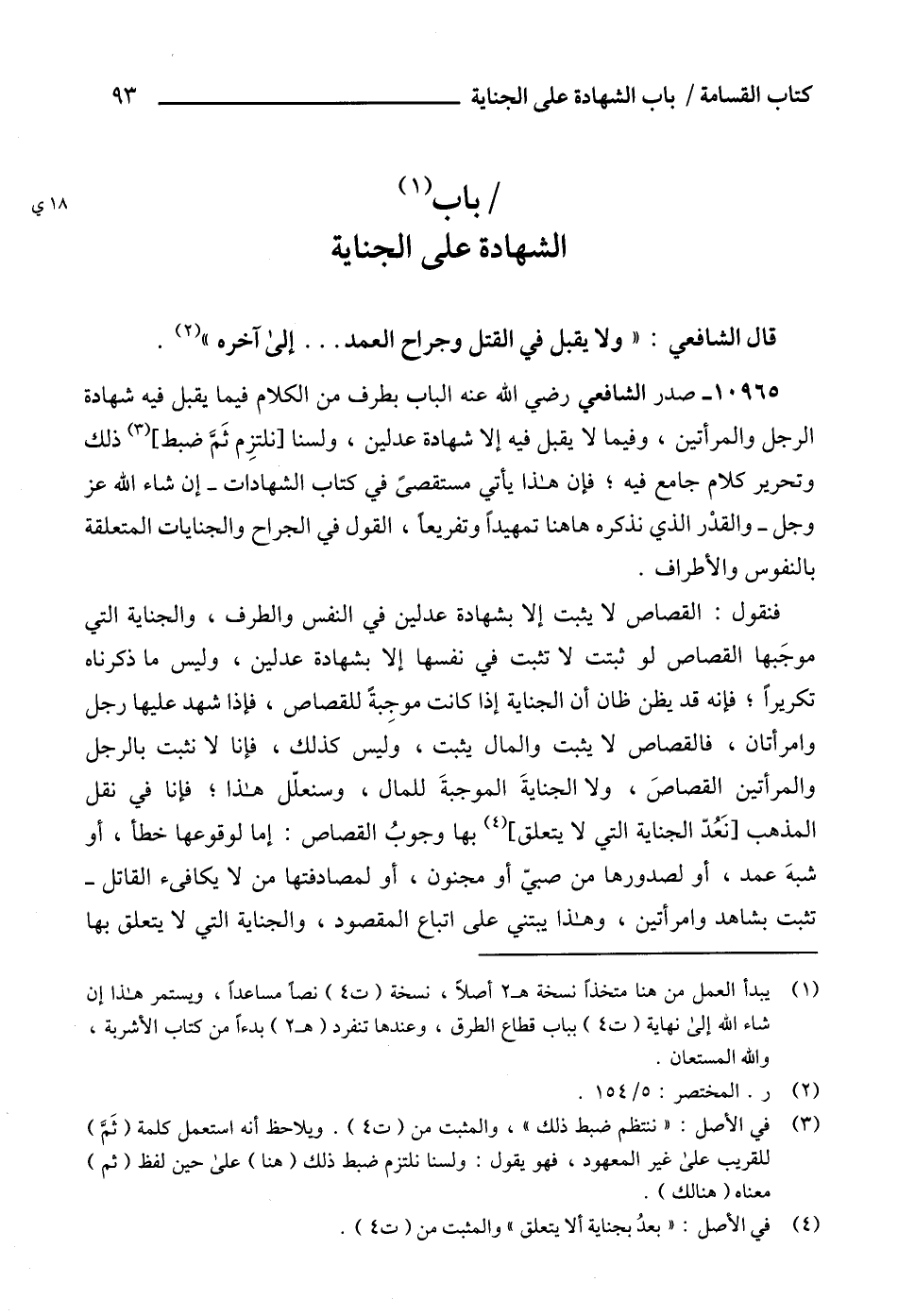 10965 - صدر الشافعي رضي الله عنه الباب بطرف من الكلام فيما يقبل فيه شهادة الرجل والمرأتين، وفيما لا يقبل فيه إلا شهادة عدلين، ولسنا [نلتزِم ثَمَّ ضبط] (3) ذلك وتحرير كلام جامع فيه؛ فإن هذا يأتي مستقصىً في كتاب الشهادات -إن شاء الله عز وجل- والقدْر الذي نذكره هاهنا تمهيداً وتفريعاً، القول في الجراح والجنايات المتعلقة بالنفوس والأطراف.