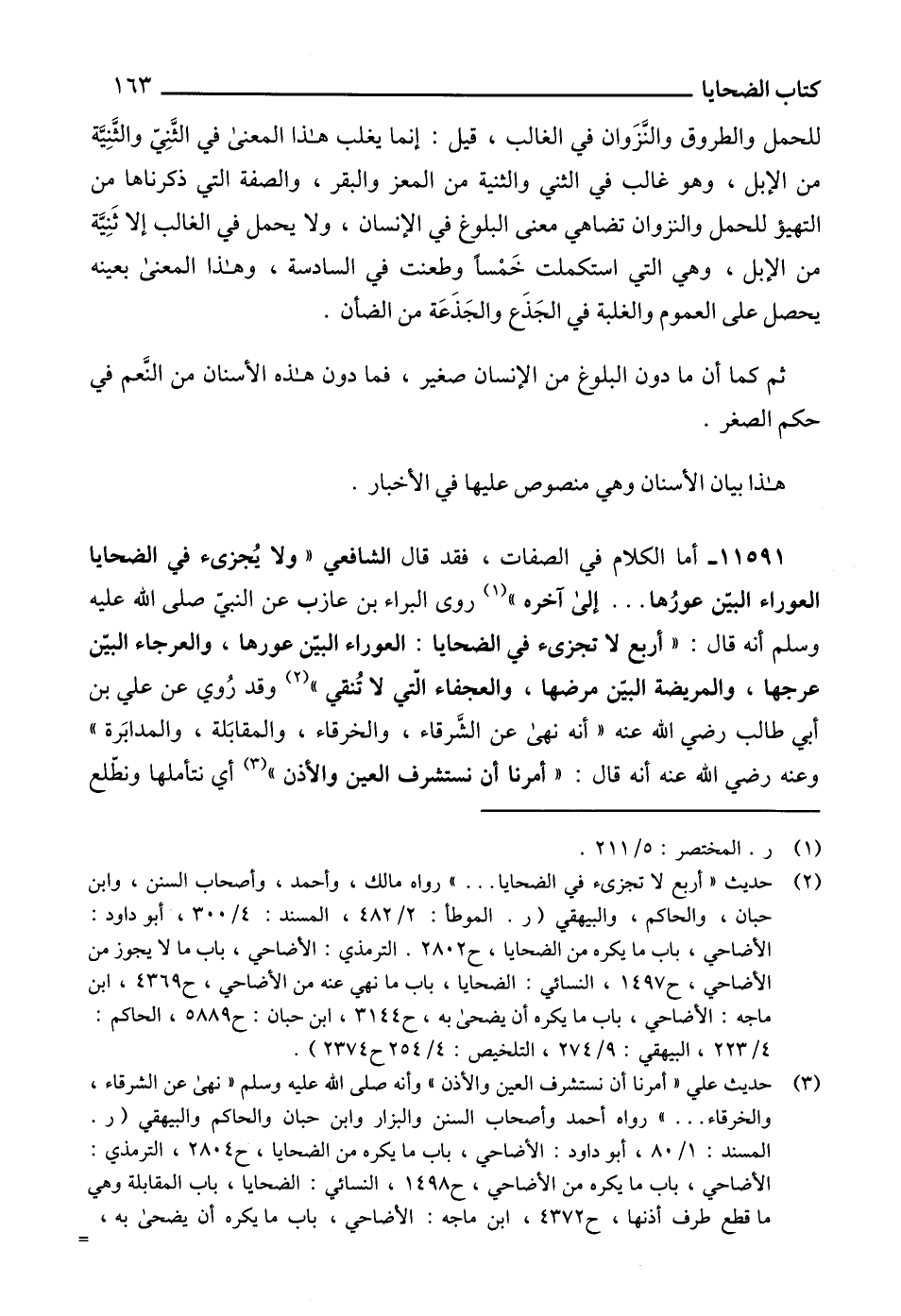 (2) حديث " أربع لا تجزىء في الضحايا ... " رواه مالك، وأحمد، وأصحاب السنن، وابن حبان، والحاكم، والبيهقي (ر. الموطأ: 2/ 482، المسند: 4/ 300، أبو داود: الأضاحي، باب ما يكره من الضحايا، ح 02802 الترمذي: الأضاحي، باب ما لا يجوز من الأضاحي، ح 1497، النسائي: الضحايا، باب ما نهي عنه من الأضاحي، ح 4369، ابن ماجه: الأضاحي، باب ما يكره أن يضحى به، ح 3144، ابن حبان: ح 5889، الحاكم: 4/ 223، البيهقي: 9/ 274، التلخيص: 4/ 254 ح 2374).