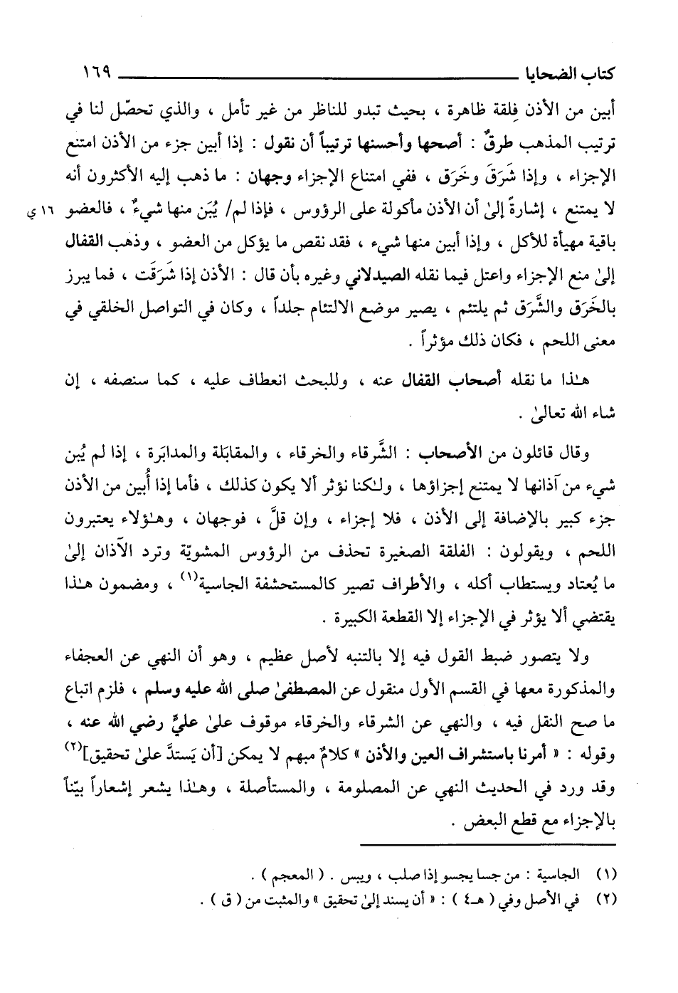 ولا يتصور ضبط القول فيه إلا بالتنبه لأصل عظيم، وهو أن النهي عن العجفاء والمذكورة معها في القسم الأول منقول عن المصطفى صلى الله عليه وسلم، فلزم اتباع ما صح النقل فيه، والنهي عن الشرقاء والخرقاء موقوف على عليٍّ رضي الله عنه، وقوله: " أمرنا باستشراف العين والأذن " كلامٌ مبهم لا يمكن [أن يَستدَّ على تحقيق] (2) وقد ورد في الحديث النهي عن المصلومة، والمستأصلة، وهذا يشعر إشعاراً بيّناً بالإجزاء مع قطع البعض.