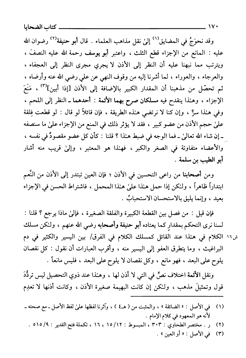 وقد نحوَجُ في المضايق (1) إلى نقل مذاهب العلماء. قال أبو حنيفة (2) رضوان الله عليه: المانع من الإجزاء قطع الثلث، واعتبر أبو يوسف رحمة الله عليه النصفَ، ويترتب مما نبهنا عليه أن النظر إلى الأذن لا يجري مجرى النظر إلى العجفاء، والعرجاء، والعوراء، لما أشرنا إليه من وقوف النهي عن علي رضي الله عنه وأرضاه، ثم تحصّل من مذهبنا أن المقدار الكبير بالإضافة إلى الأذن [إذا أبين] (3)، مَنَعَ الإجزاء، وهذا ينقدح فيه مسلكان صرح بهما الأئمة: أحدهما - النظر إلى اللحم، وفي هذا سرٌّ، وإن كنا لا نرتضي هذه الطريقة، فإن قائلاً لو قال: لو قطعت فِلقة على حجم الأذن من عضو كبير، فقد لا يؤثر ذلك في المنع من الإجزاء على ما سنصفه -إن شاء الله تعالى- فما الوجه في ضبط هذا؟ قلنا: كأن كل عضو مقصودٌ في نفسه، والأعضاء متفاوتة في الصغر والكبر، فهذا هو المعتبر، وإلى قريب منه أشار أبو الطيب بن سلمة.