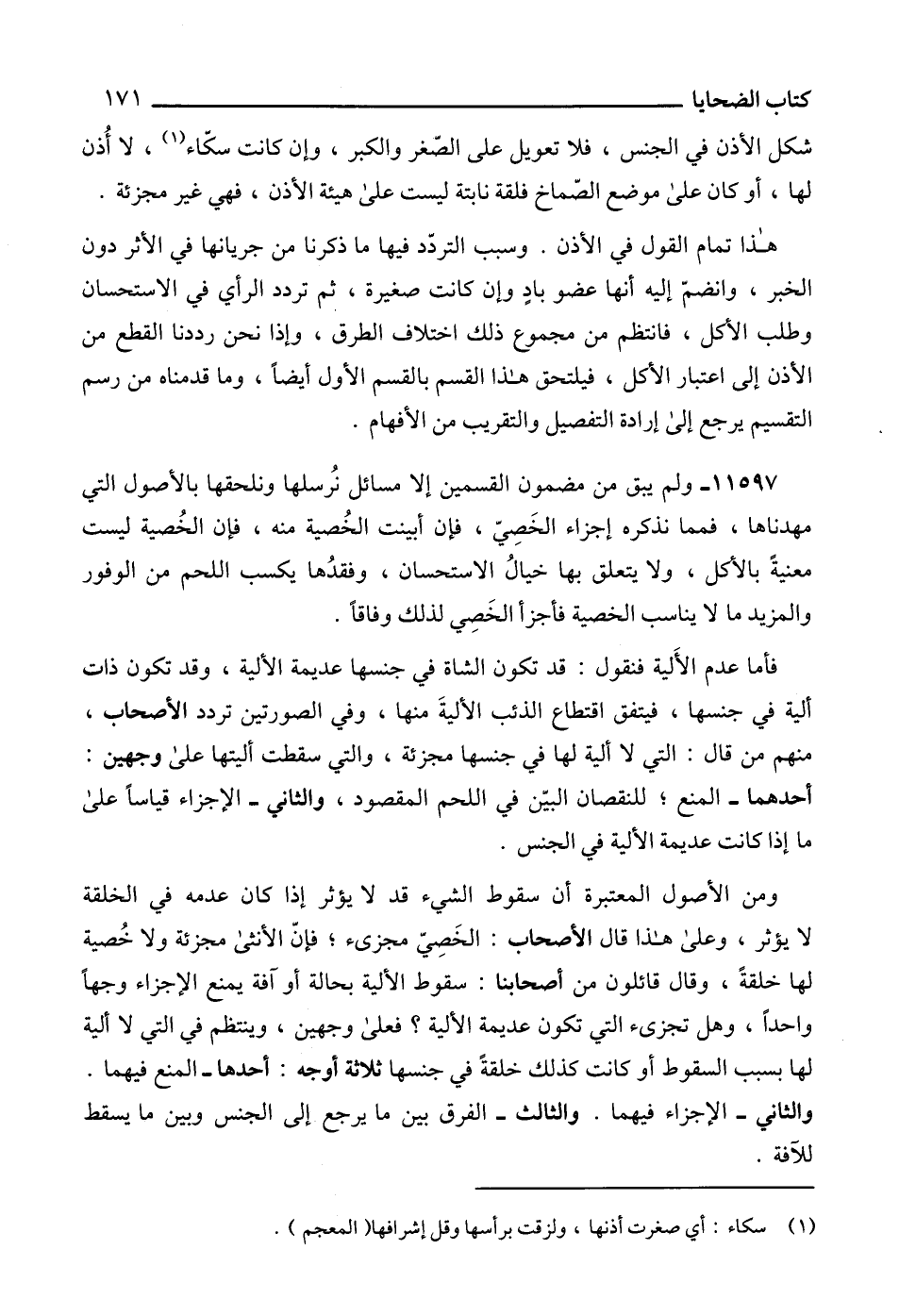 11597 - ولم يبق من مضمون القسمين إلا مسائل نُرسلها ونلحقها بالأصول التي مهدناها، فمما نذكره إجزاء الخَصِيّ، فإن أبينت الخُصية منه، فإن الخُصية ليست معنيةً الأكل، ولا يتعلق بها خيالُ الاستحسان، وفقدُها يكسب اللحم من الوفور والمزيد ما لا يناسب الخصية فأجزأ الخَصِي لذلك وفاقاً.