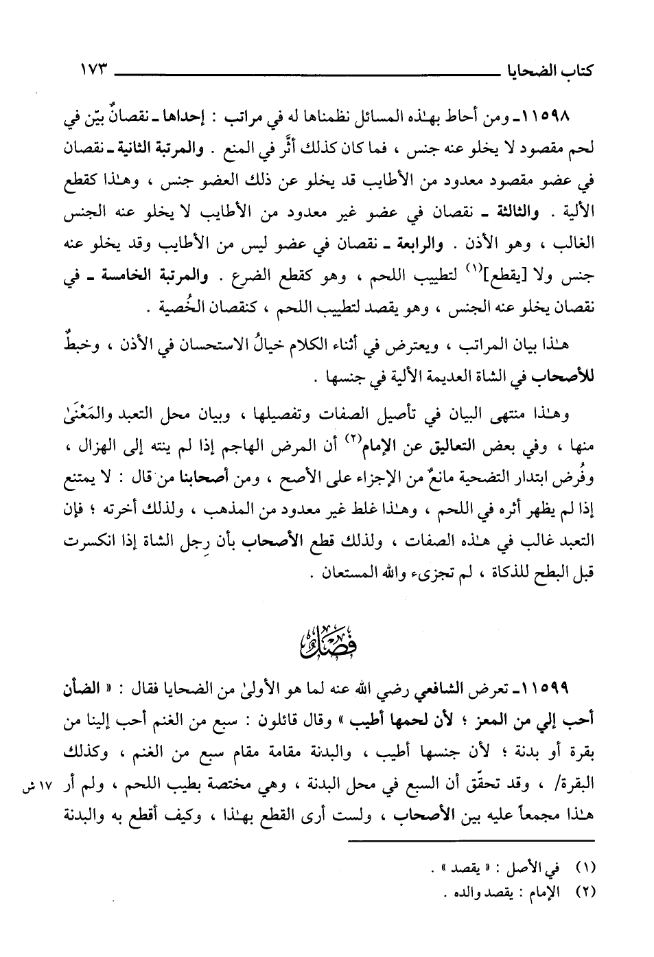 11598 - ومن أحاط بهذه المسائل نظمناها له في مراتب: إحداها - نقصانٌ بيّن في لحم مقصود لا يخلو عنه جنس، فما كان كذلك أثَّر في المنع. والمرتبة الثانية - نقصان في عضو مقصود معدود من الأطايب قد يخلو عن ذلك العضو جنس، وهذا كقطع الألية. والثالثة - نقصان في عضو غير معدود من الأطايب لا يخلو عنه الجنس الغالب، وهو الأذن. والرابعة - نقصان في عضو ليس من الأطايب وقد يخلو عنه جنس ولا [يقطع] (1) لتطييب اللحم، وهو كقطع الضرع. والمرتبة الخامسة - في نقصان يخلو عنه الجنس، وهو يقصد لتطييب اللحم، كنقصان الخُصية.