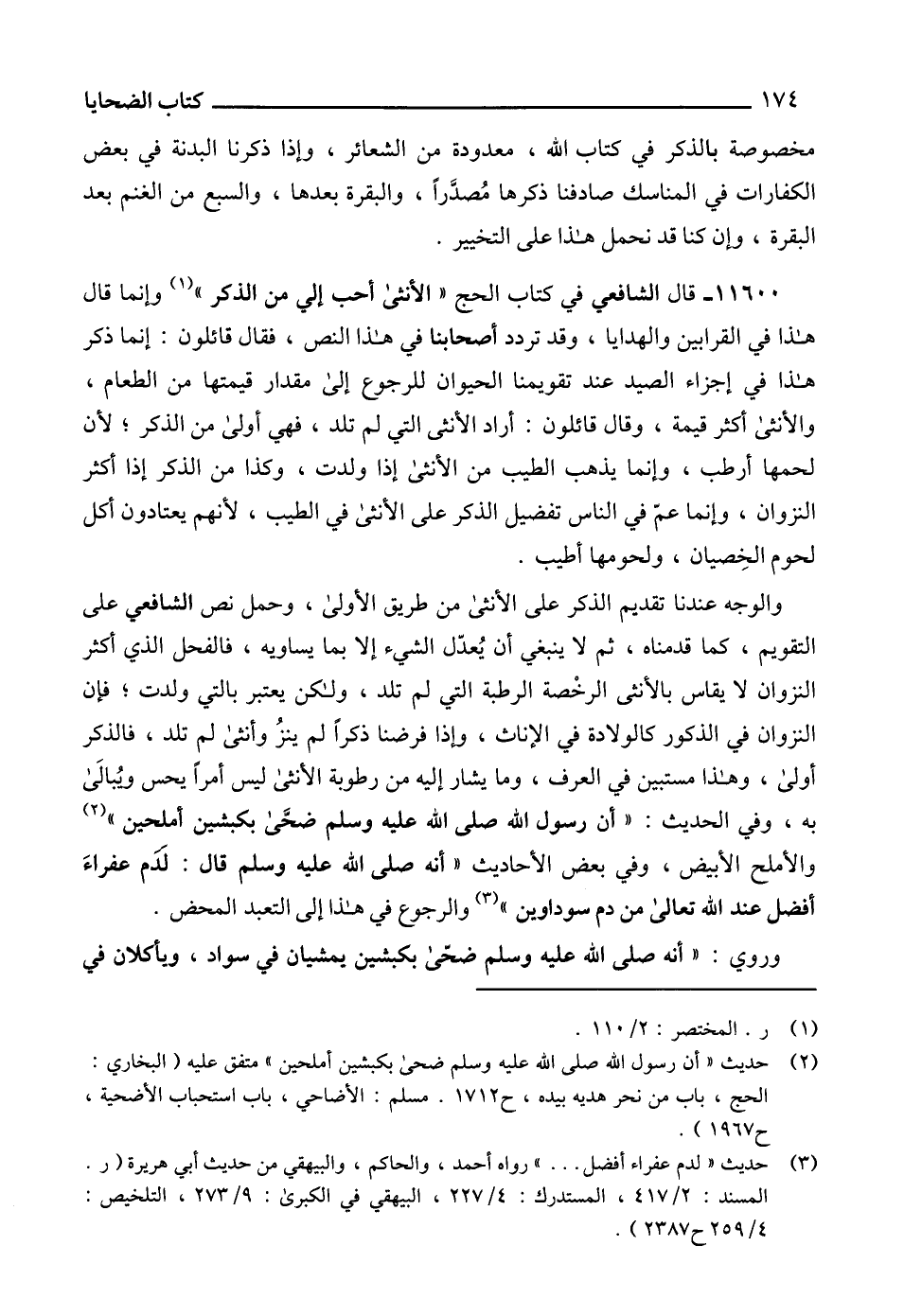 11600 - قال الشافعي في كتاب الحج " الأنثى أحب إلي من الذكر " (1) وإنما قال هذا في القرابين والهدايا، وقد تردد أصحابنا في هذا النص، فقال قائلون: إنما ذكر هذا في إجزاء الصيد عند تقويمنا الحيوان للرجوع إلى مقدار قيمتها من الطعام، والأنثى أكثر قيمة، وقال قائلون: أراد الأنثى التي لم تلد، فهي أولى من الذكر؛ لأن لحمها أرطب، وإنما يذهب الطيب من الأنثى إذا ولدت، وكذا من الذكر إذا أكثر النزوان، وإنما عمّ في الناس تفضيل الذكر على الأنثى في الطيب، لأنهم يعتادون أكل لحوم الخِصيان، ولحومها أطيب.